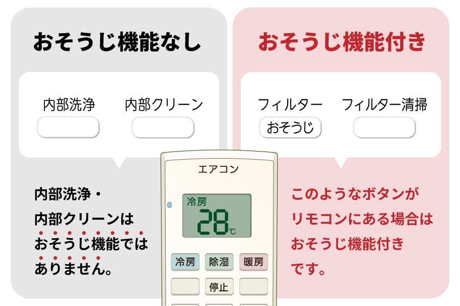 - リモコンに『フィルター掃除』『自動お掃除』『おそうじ機能』などの表示がない。