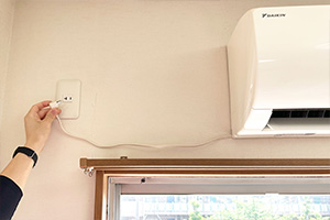 コンセントがある場合は抜き、隠れている場合はブレーカーを落とします。