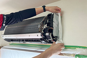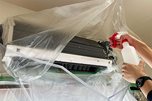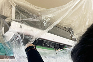 エアコン周辺の壁、床などに養生シートを敷き、周辺を汚さないよう万全の準備をします。