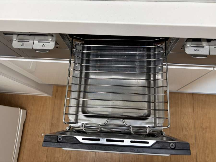 ① グリル内部にこびり付いた焦げ付きや油汚れを、素材を傷めないよう丁寧に除去しました。