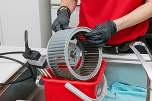 換気扇ファン(シロッコファン)は取り外して徹底洗浄します。プロ用の強力な洗剤に高温のお湯でつけ置きし、柔らかくなった油汚れをブラシでしっかり洗い流します。羽根の一枚一枚までピカピカに洗い上げ、換気効率を新品同様に回復させます。