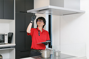 レンジフード本体の外装に傷や変色がないか丁寧にチェックします。