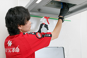 レンジフード本体の内部(フード内部やダクト入口付近)に、人と環境に優しいエコ洗剤を吹きかけます。