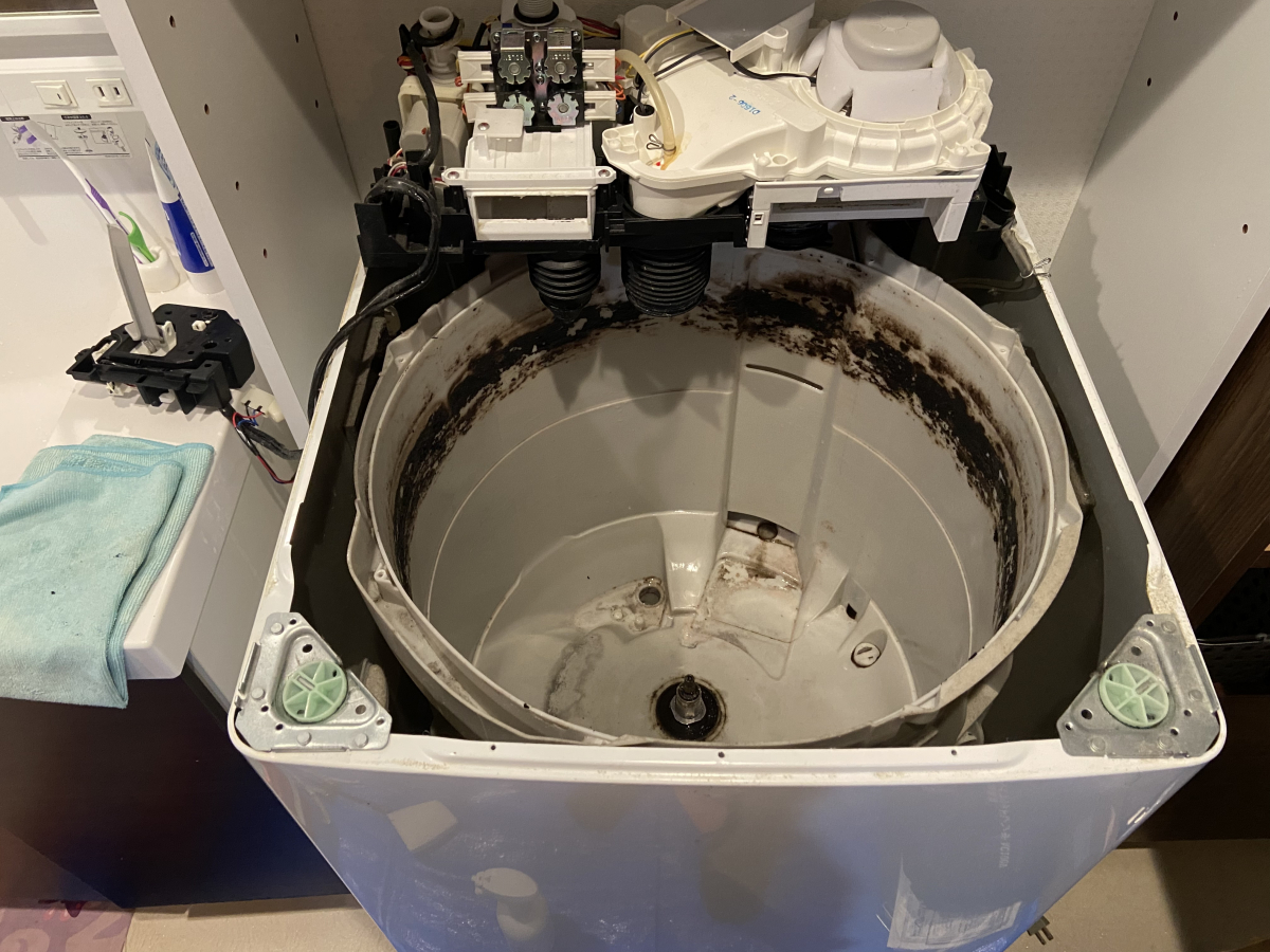 洗濯槽を外した箇所はこんな感じで上側の部分がどうしても洗剤などが残ってしまい、かなり汚れていますね!