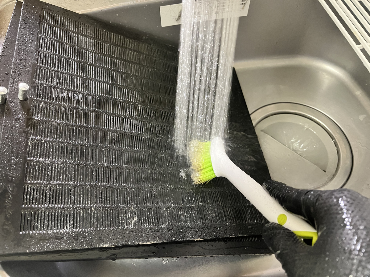 お湯をかけながらがミソ。洗剤はまだいりません。こうすることで層になっている油がお湯の力で取れていきます。その際ブラシにどんどん油汚れが移ってしまいますが気にせず全体を擦ってください。