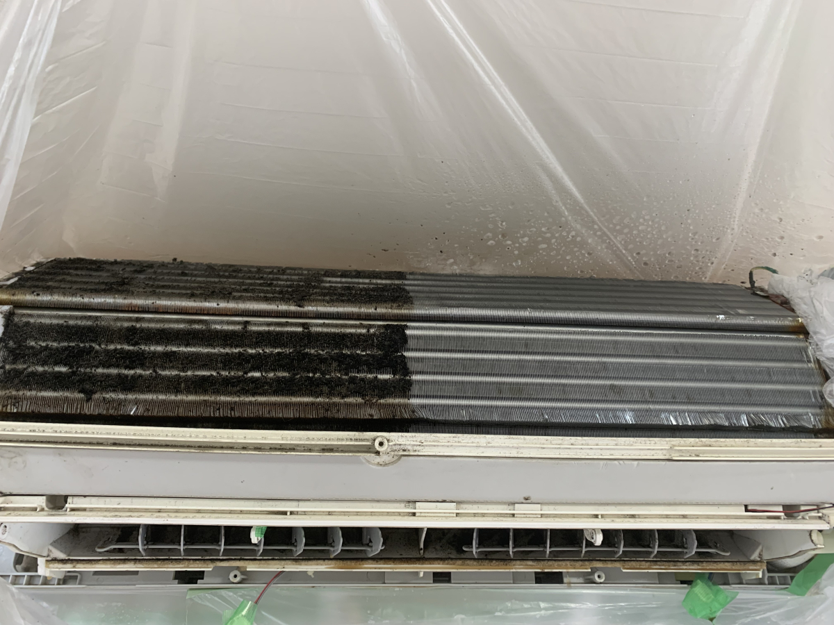 エアコン清掃はこのホコリやカビをまず薬剤に反応させて柔らかくし、それを高圧洗浄機で水の圧力を使ってすすぎながら押し出していく事になります。