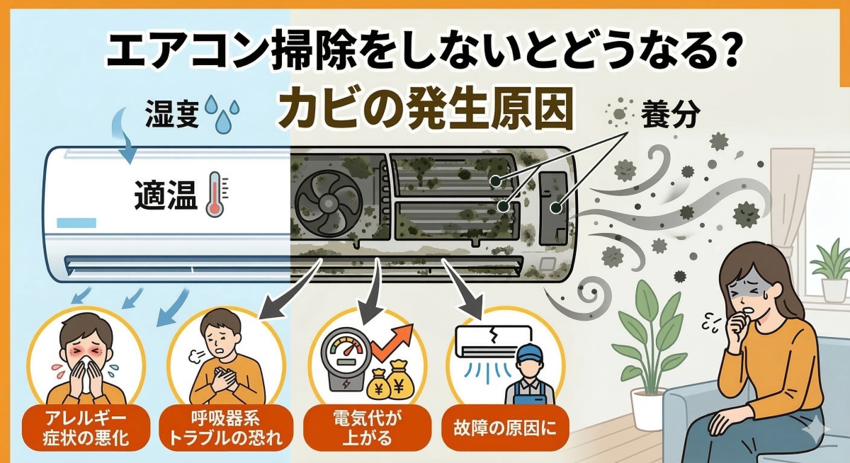 エアコン掃除をしないことによる「カビの危険性」と、健康・家計への悪影響について解説しました。