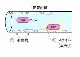 配管内部に水あか(スケール)や雑菌が徐々に付着し始め、放置するとバイオフィルムという