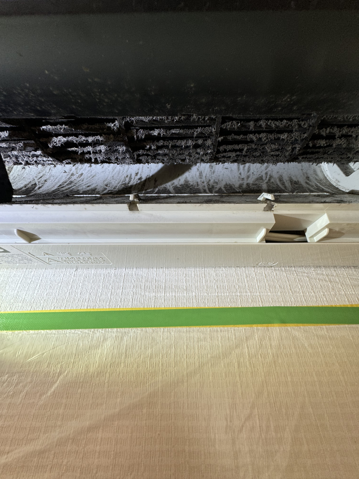 こちら、この家のご主人様が一生懸命キレイにしたいという思いから、市販のエアコン洗浄スプレーでそうじをしたことのあるエアコンのファンと吐き出し口です。もう自分じゃどうにもならないと、ご依頼いただきました。カバーを外し、ルーバーを外し吐き出し口とファンの写真をご主人にお見せしたところ、『うわ、こんなに汚かったのか』と。