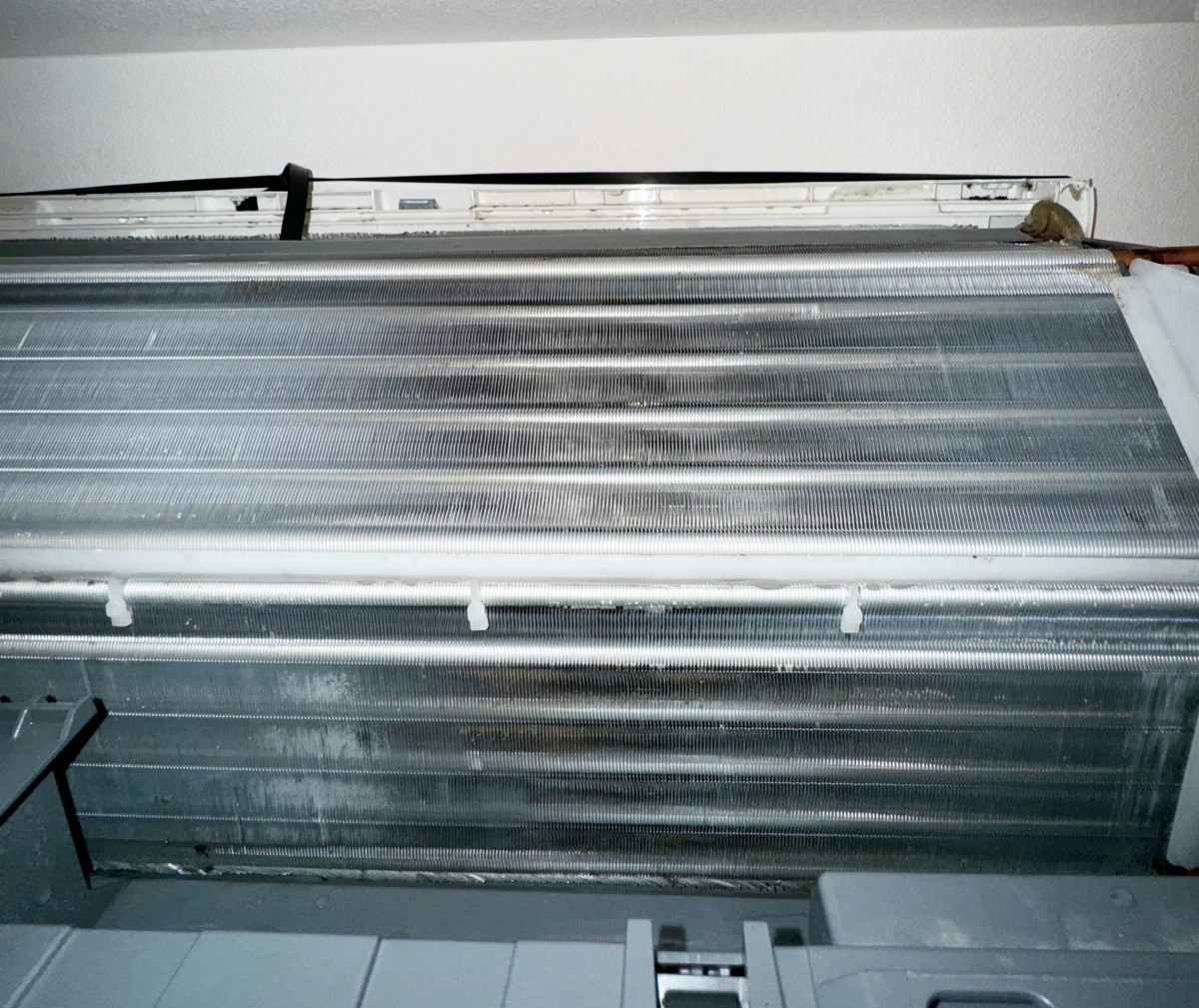 画像はリビング設置のエアコンの清掃前の熱交換器と送風ファン。