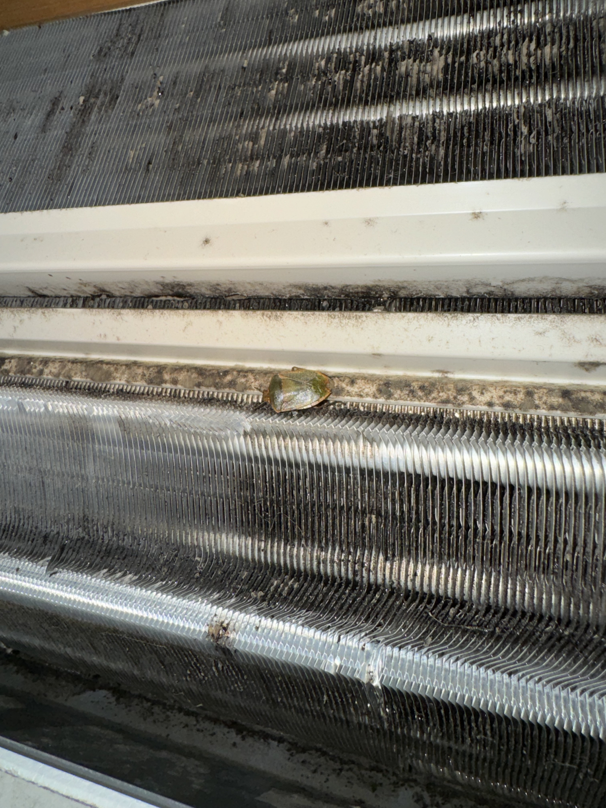 熱交換器にカメムシもいました。こういった虫がドレン配管に住みつき、詰まりや水漏れの原因になることもあります。