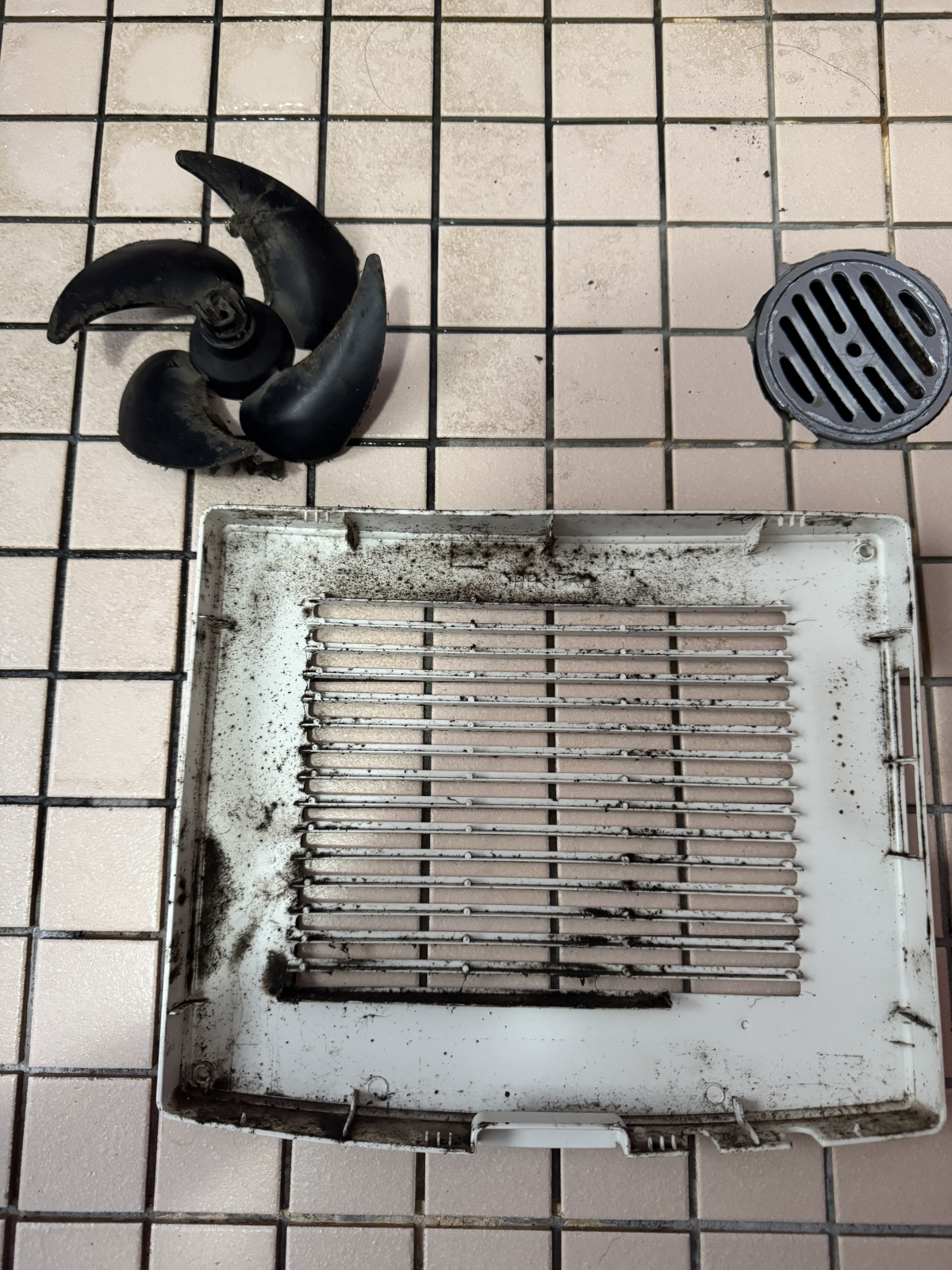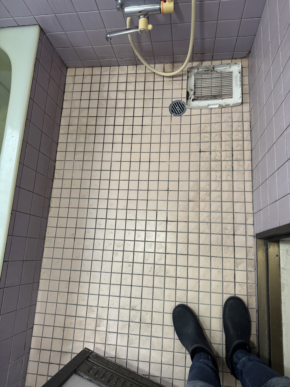浴室壁面全面タイルの浴室でした。石鹸カス汚れが多く、ピンクカビも多く見受けられました。天井もカビが多い印象でした。換気扇内部もホコリとカビが、多かったです。