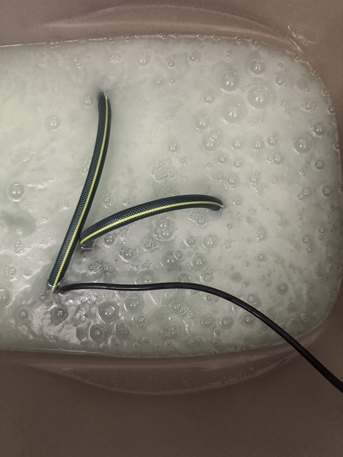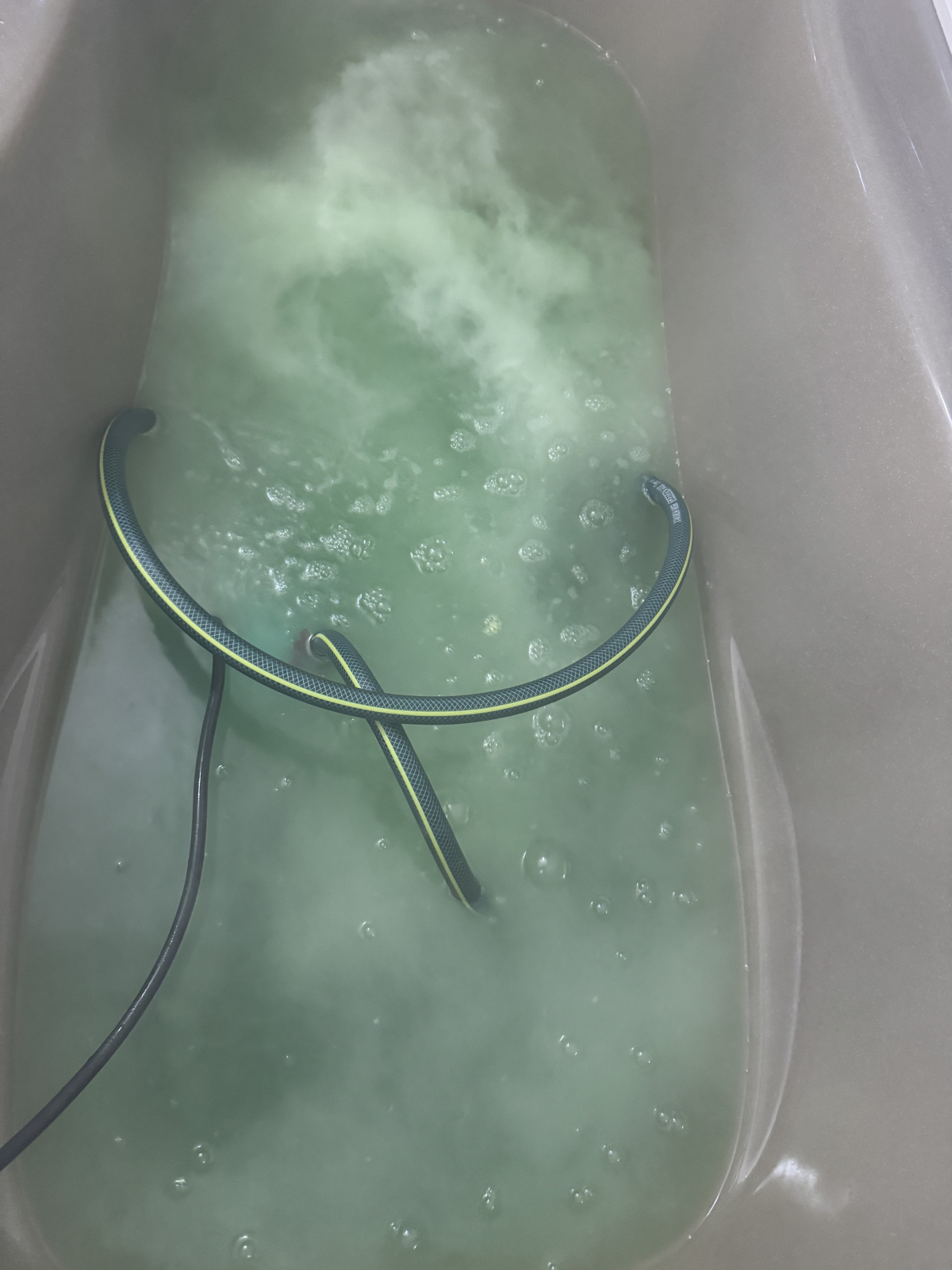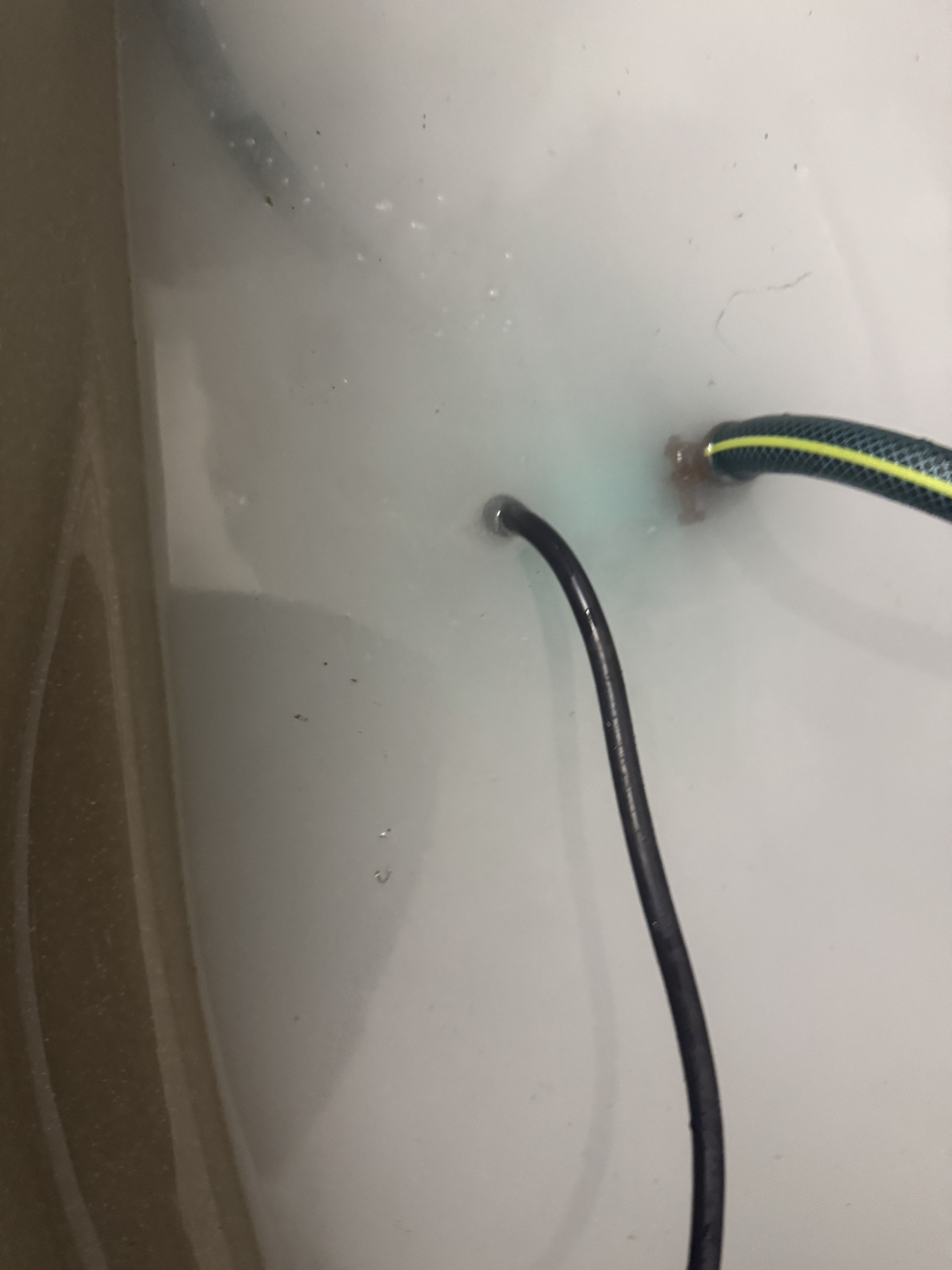 まずは、酸性薬剤を追い焚き配管へ。配管内の汚れを除去していきます。1枚目2枚目のお写真の液面に浮いてる浮遊物が配管内部の汚れです。