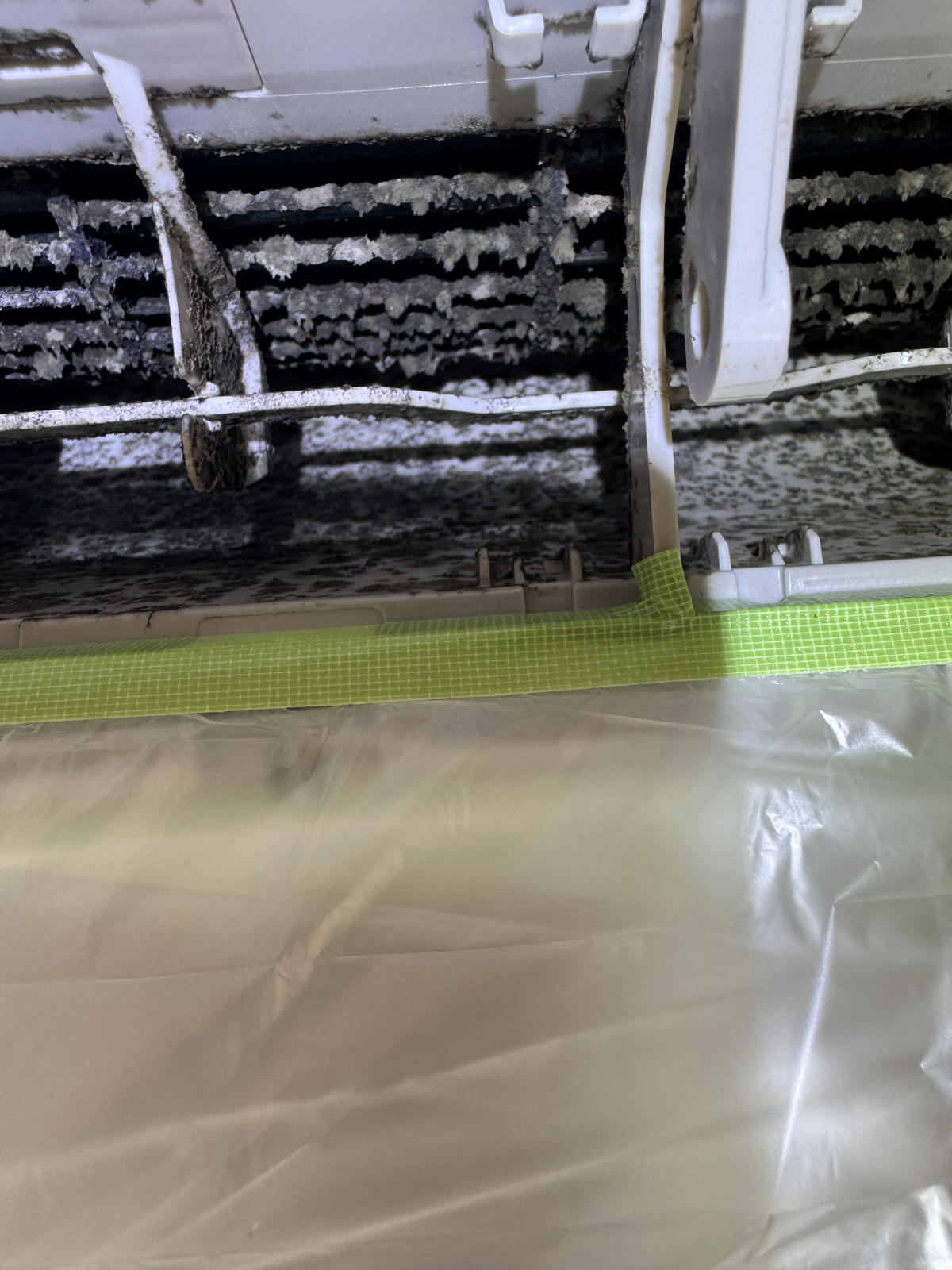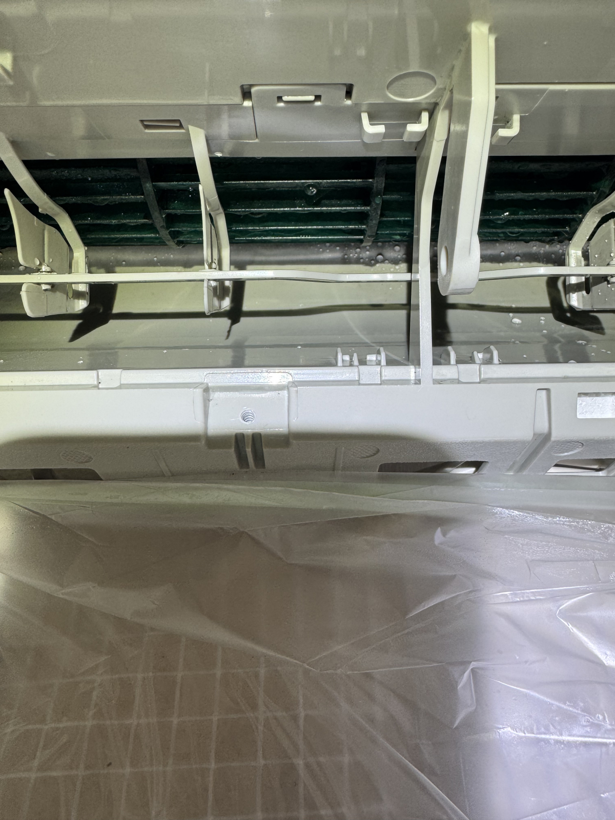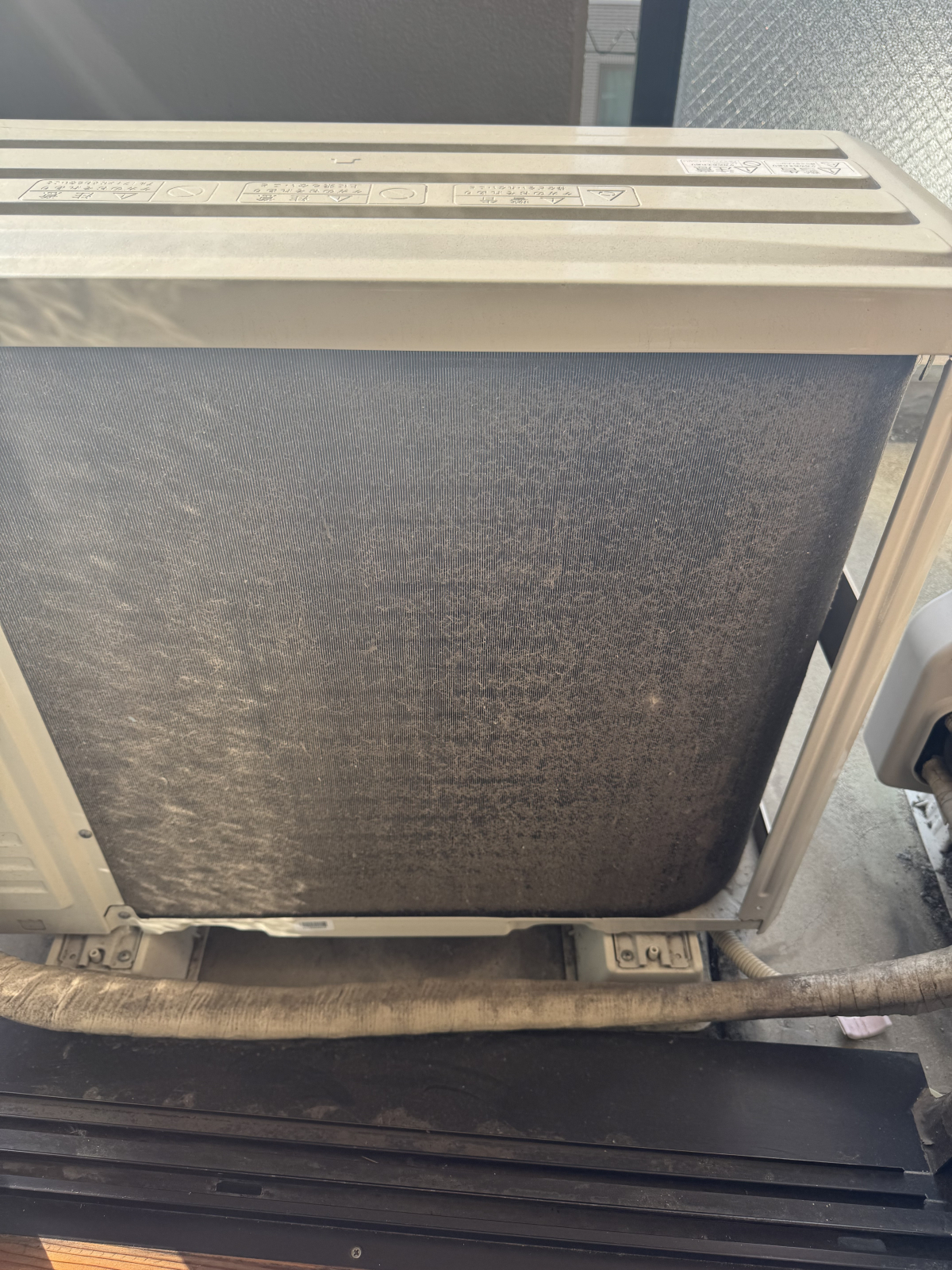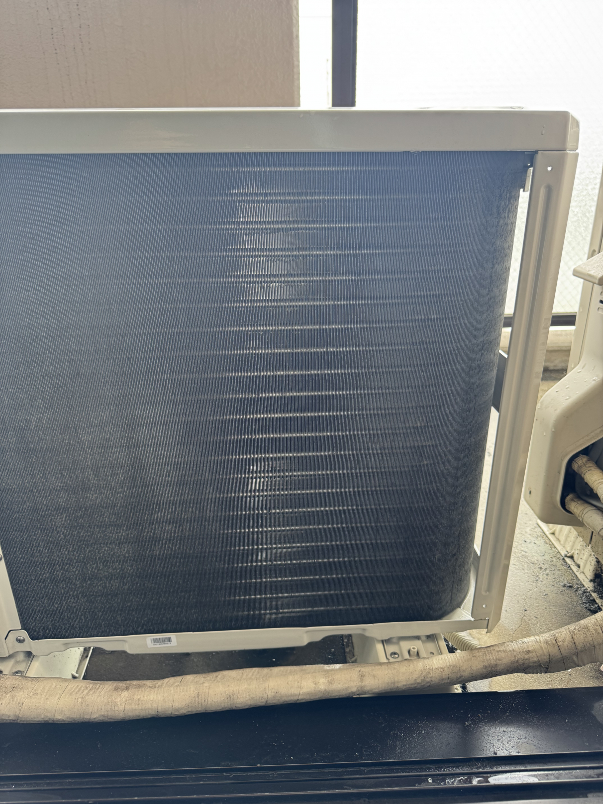 今回は室外機も拝見させていただき、つまりが酷かったので清掃のご提案もさせていただきました。室外機の熱交換器が詰まっていると、熱交換の効率が下がりエアコンの効きが悪くなったりしますので、定期的に清掃をお勧め致します。