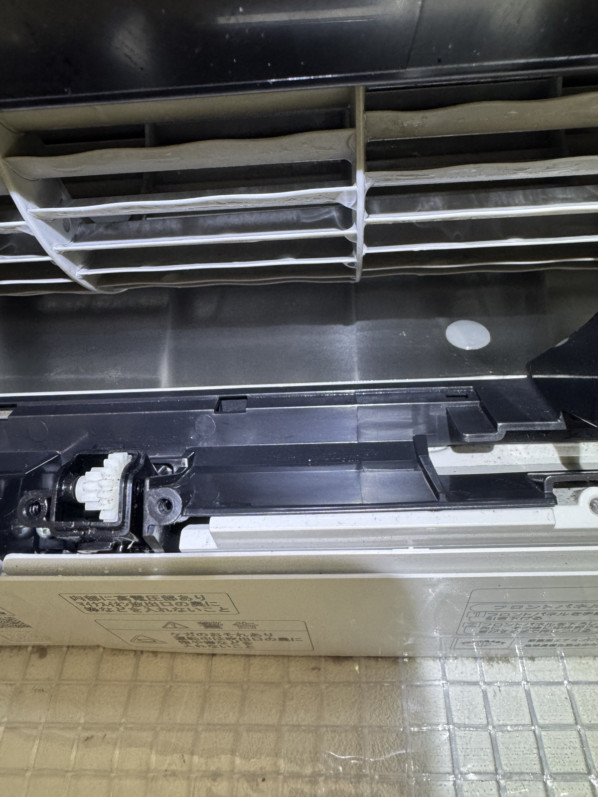 そして、前面可動式パネルなのでギアを押さえているプラスチックカバーの破損も事前に確認します。経年劣化により、プラスチックカバー自体が劣化してヒビが入っていたり割れていたりすることも多々あります。