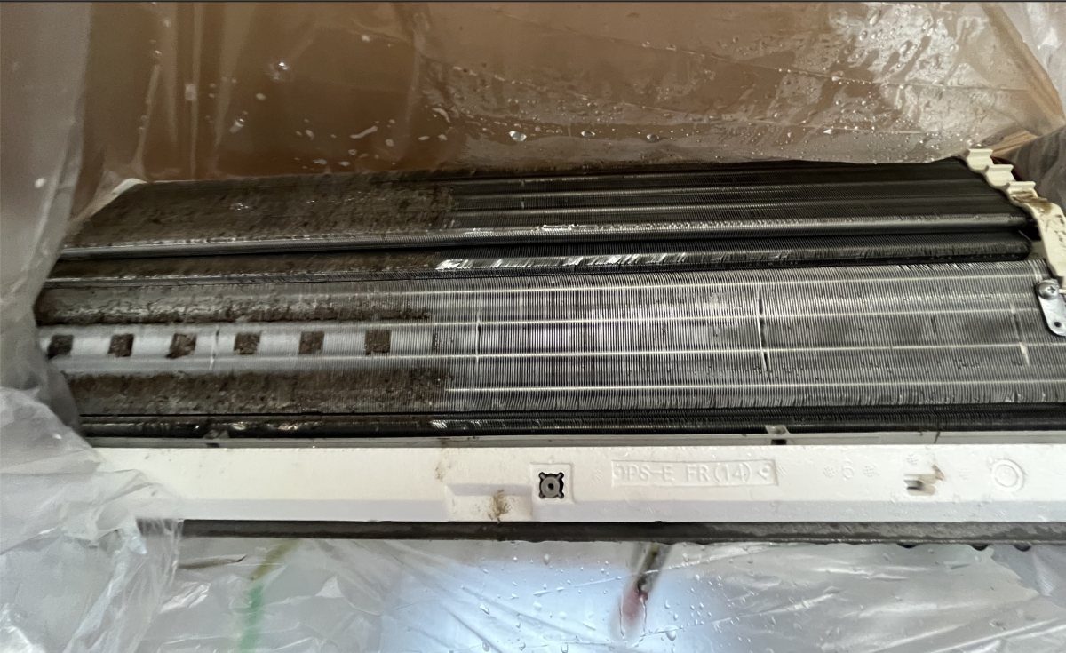 このエアコンを分解すると、内部にはホコリやカビがたくさんありました。