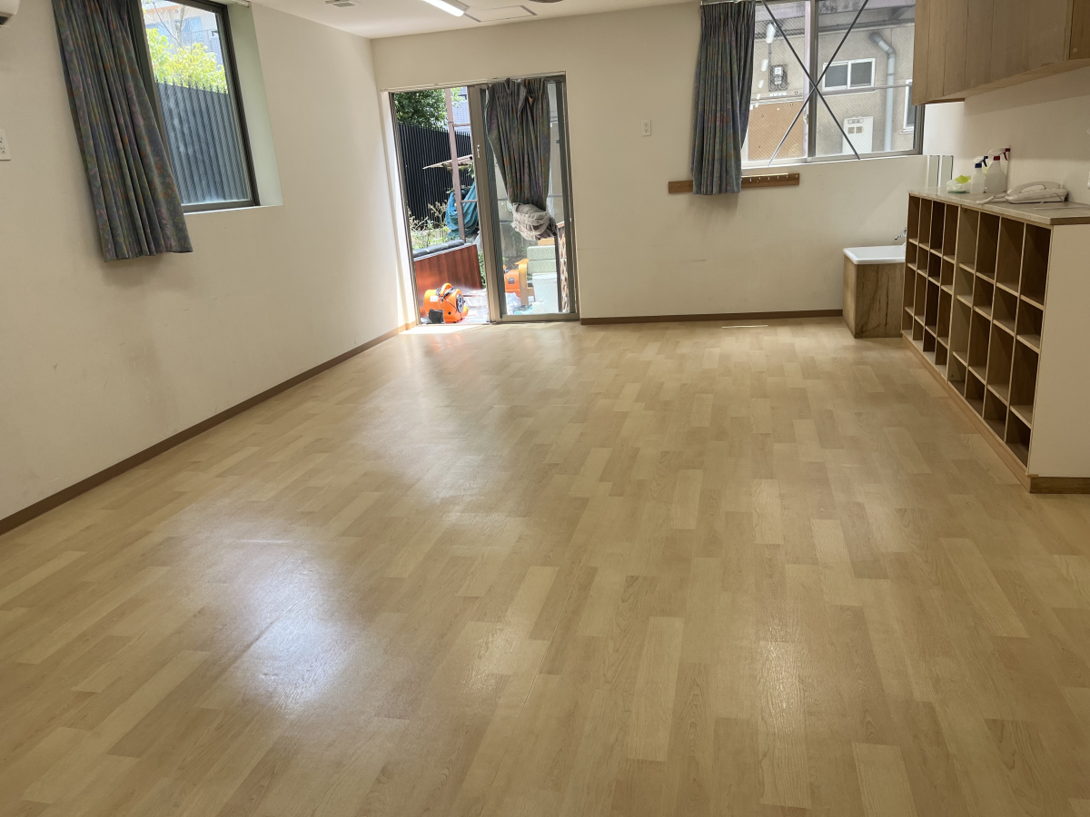 床のお清掃で、小さいゴミや、ほこり、菌を除去したあとにワックスで仕上げると、床は面積が大きいので空間全体がキレイに見えます。