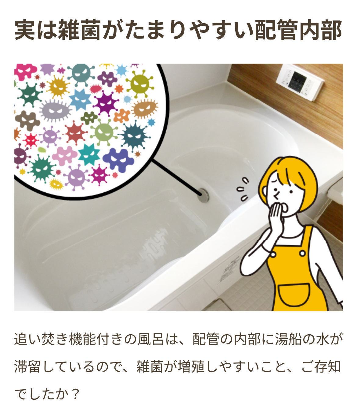 みなさんには、浴室クリーニングをご依頼される際は一緒に、「浴室追い焚き配管除菌洗浄」もおすすめします。