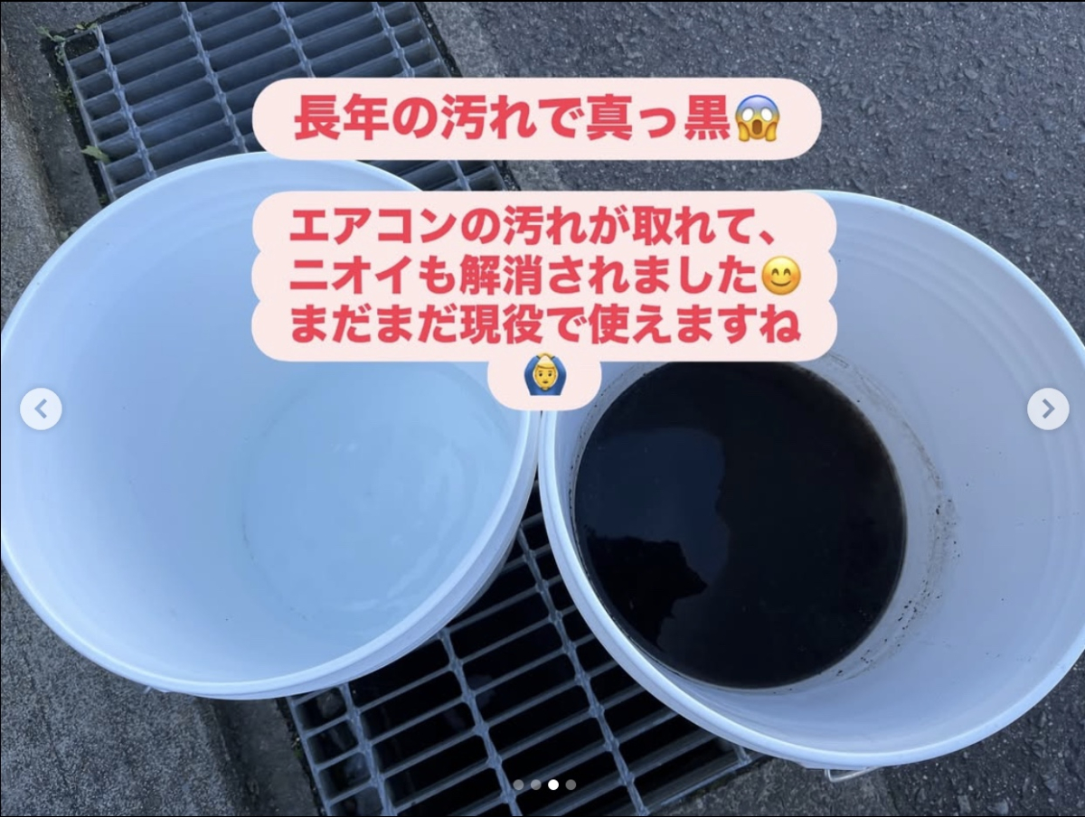 エアコンから出てきた汚水は真っ黒で、透明度はほぼ0でした。