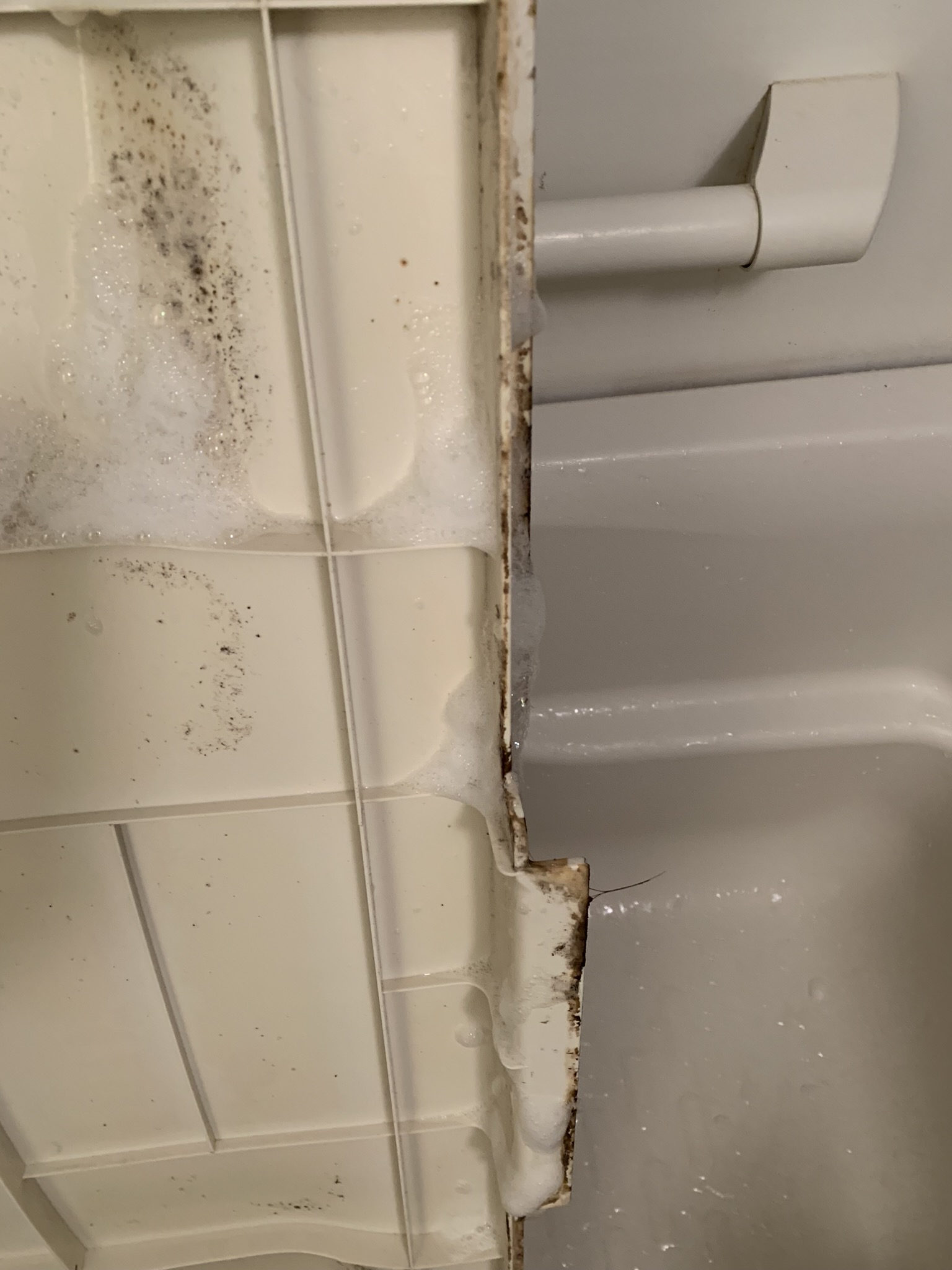 今日の作業はお風呂のクリーニングでした。結構ハードに汚れがついていましたのでそれぞれの部位での作業のご説明です。まずエプロンカバー内です。「エプロンカバーってなに?」という方のためにご説明しますと戸建住宅よりもマンションのお風呂に多いのですが、バスタブの横(正面というべき?)がふたのようになっていて外れるようになっています。これがエプロンカバーです。そのエプロンカバーとバスタブの間は結構な隙間があります。なぜこのような構造になっているかと言うと浴槽の周りに空気の層を作ることによりお風呂のお湯を冷めにくくするためです。ただこのエプロン構造ですが、パッキンによってほぼ完璧に外部から遮断されているものは別として内部の高い湿度、ゴミや皮脂汚れや石鹸カスなどの汚れが流れ込んでくる、光が当たらないなどの条件でカビの絶好の繁殖場所になっています。写真はエプロンカバーを外して手前の方を撮ったものとエプロンカバーの裏側です。どちらもカビ用の洗剤をかけた直後に撮ったので特にエプロンカバーの内側はカビの消えたところとカビの生えたところのコンストラクトがお分りいただけると思います。バスタブの下のあたりは髪の毛に色々な汚れが絡みついたものが堆積しておぞましい感じがしました。奥の方は黒いカビがびっしり生えていました。
