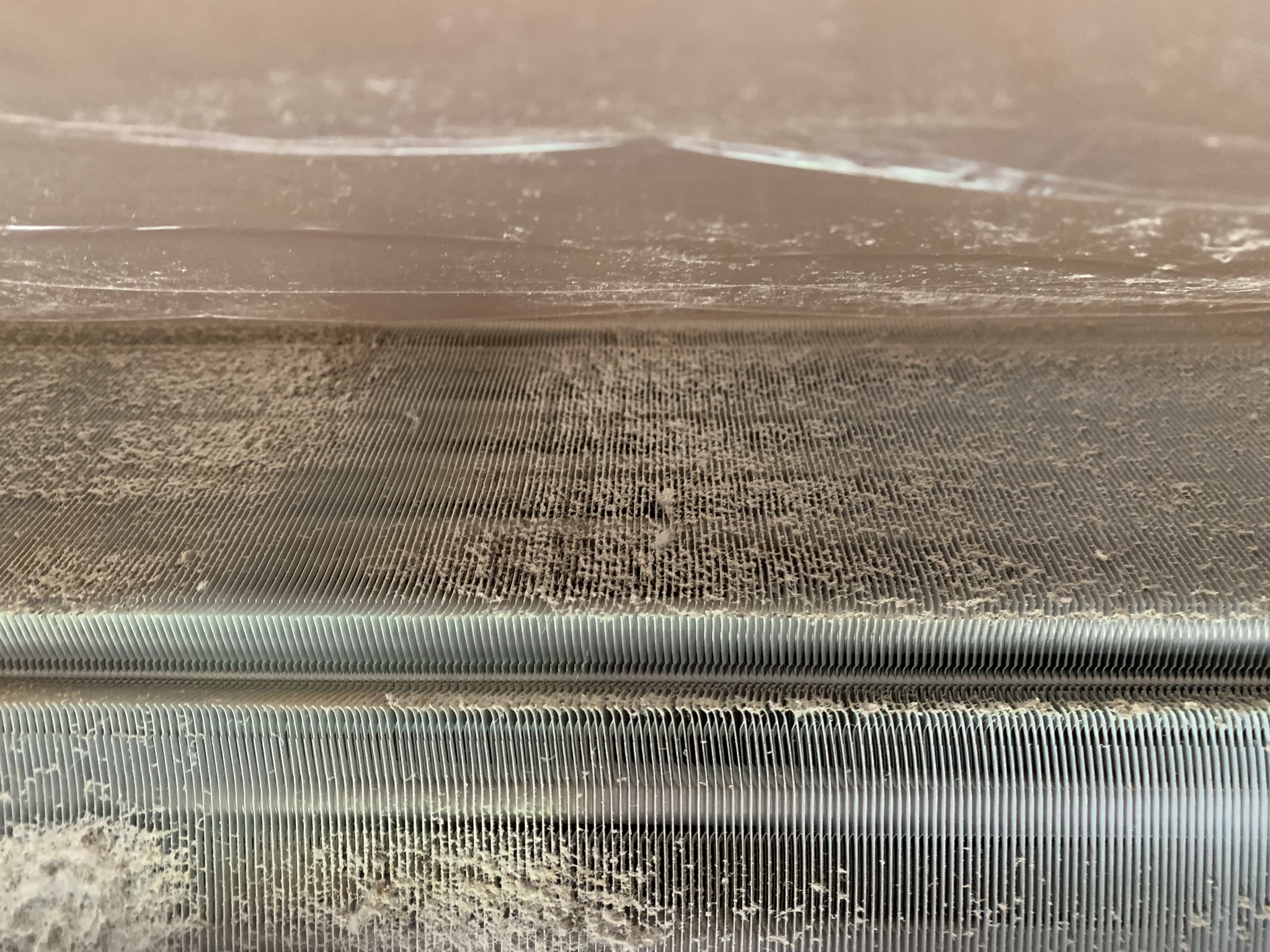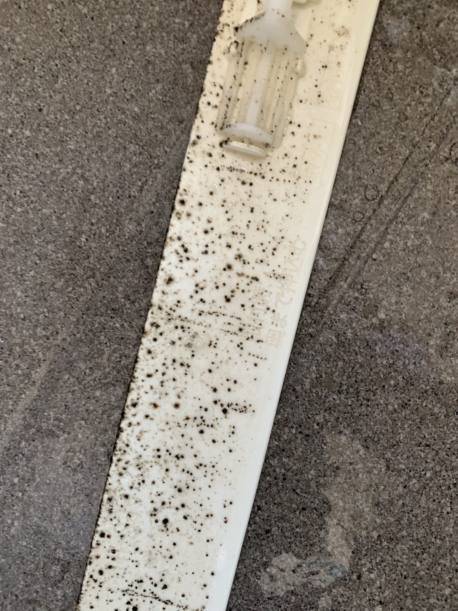 エアコンの掃除っていつやりますか?何年か前に買ったけどまだ一度もしていないという方もいらっしゃるかと思いますが、冷房を使い始める前や使い始めてからという方が多いと思います。久しぶりに冷房をつけて見てかなりカビ臭いので慌てて清掃業者を呼ぶという感じでしょうか。実際にエアコンクリーニングのご注文は梅雨明け前後あたりに殺到するような感じです。エアコン清掃に伺ったお宅で「エアコンの掃除はいつやればいいですか?」というご質問をよくいただきます。答えを申しますとまさに今のこの時期が良いと思います。エアコンの汚れや臭いの元は主にカビです。このカビですがなぜエアコンの中に生えるかというと、冷房にした時にエアコン内部が温度差によって結露が生じて湿っぽくなります。このために主に熱交換器と呼ばれる箇所や空気の吹き出し口の奥にあるシロッコファンにカビが生えます。冷房を使う前や使い始めの時にクリーニングしても冷房にしている間はエアコン内部が常に湿っていてカビが生えやすいということになります。冷房を使わなくなった今エアコンを掃除しておけば理論上来年の夏までは綺麗な状態が続くというわけです。また今エアコンクリーニングをしておけば気持ちよく暖房も使えるようになります。今でしたらこちらのスケジュールもいくらか余裕がありますが、もう少しすると年末の大掃除の需要で繁忙期に入るのでせっかくエアコンクリーニングのご注文をいただいてもご希望の日程でお伺いすることができないということも考えられます。エアコンクリーニングをごけんとうの方、是非お早めにご連絡ください。写真はお掃除機能付きの清掃前のものです。空気の吹き出し口の黒い点はカビです。カバーの内側の熱交換器はビッシリ埃が詰まってました。これを掃除するだけでエアコンの風圧もかなり違ってきます。