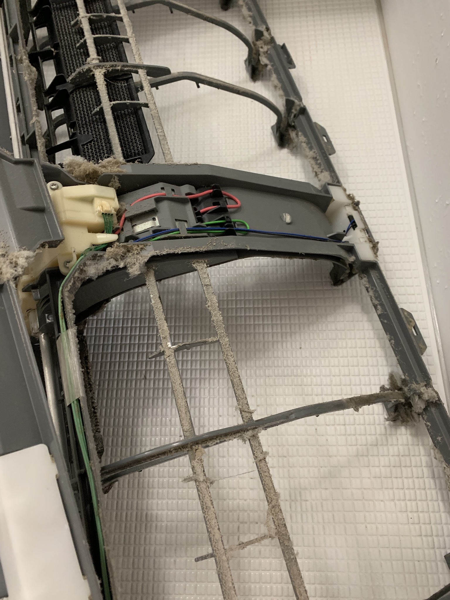 お掃除機能がついていてもいなくてもエアコンの中はカビやら埃やら調理の際の油を吸い込んで汚れます。画像は空気の吹き出し口とお掃除ロボットを外したところです。今回清掃をさせていただいたお掃除機能付きのエアコン10年くらい前に買われたものでリビングに設置されていました。このためキッチンで調理の際に出た油をかなり吸い込んでいました。油でベタベタになった空気の吹き出し口やその奥のシロッコファンや熱交換器に埃がくっついたり詰まったりしてさらに冷房時の結露による水分の発生でカビが生え結構すごいことになっていました。特にお掃除ロボットですが、皮肉なことにこれ自体が埃まみれで裏側の熱交換器に面した側はカビで真っ黒になっていました。また熱交換器もお掃除ロボットに覆われているために埃がびっしり詰まって一面にカビが生えているという有様でした。