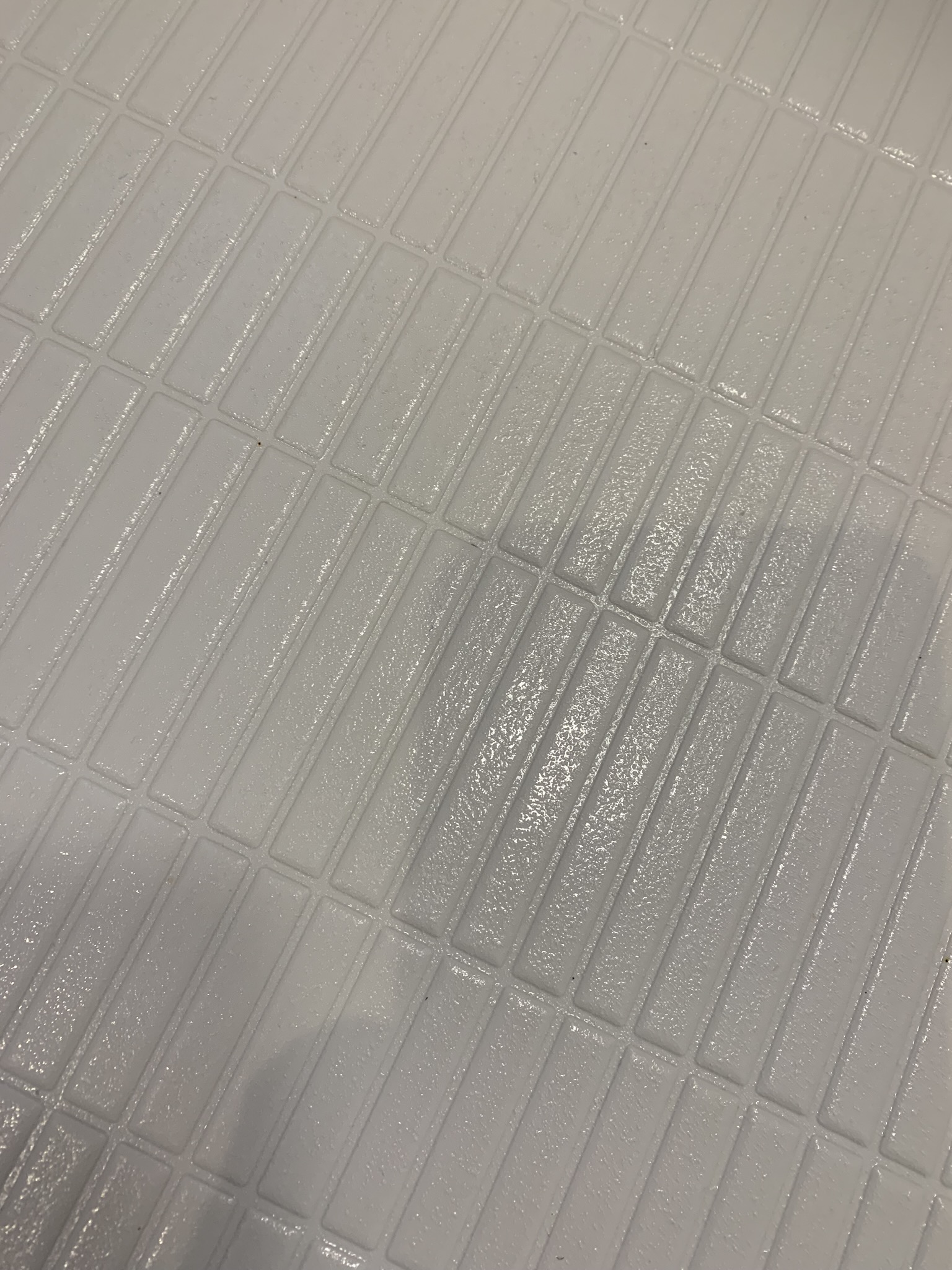 今回のお客様のおうちのお風呂場の床はパナソニック社のからり床という製品でした。こちらの製品ですが、表面に細かい穴が無数に空いていてそこから水を排出するという機能があります。そのため床を清潔に保ちやすいのですが、水は流れても汚れだけが残ってしまうということもあるようです。もちろん汚れは皮脂汚れだけではなく石鹸カスや水あかも床にこびりつきます。今回使ったのはステンレスブラシとアルカリ洗剤、それに酸性洗剤です。二種類の洗剤を使ったのは石鹸カスにはアルカリ洗剤が水あかには酸性洗剤が反応するからです。アルカリ洗剤と酸性洗剤をそれぞれ交互にかけてひたすらステンレスブラシで擦ります。それぞれ擦った後はたっぷりめの水で流します。このたっぷり目の水で流すというのがコツでしょうか。床に元の白さが戻りました。