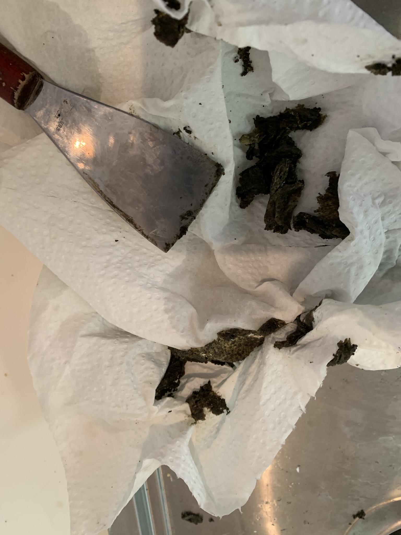 外したファンやパーツは熱した洗剤につけこみ着いた油を溶かして洗います。ファンやパーツ類を外した後の本体には洗剤をスプレーで吹きかけて洗いますが、ファンの収まっていたところは油がこびりつき堆積しているのでヘラでこそぎとった上で洗剤とパッドで洗います。
