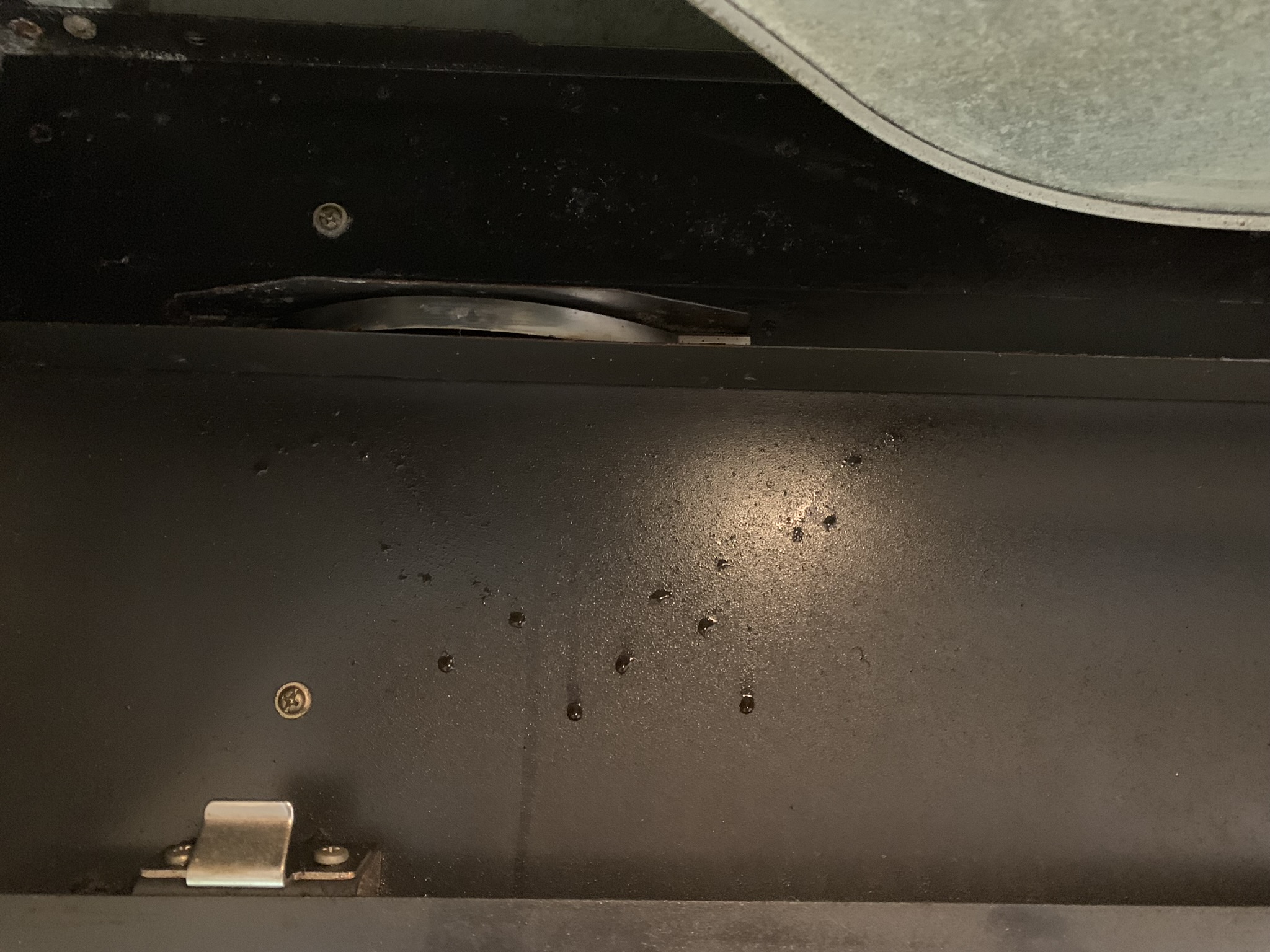 作業にあたって汚れ具合を確認しながら分解してゆきます。まず整流板という一番下についている板を開けて外します。油がだいぶ垂れてきました。それからライトなどの細かいパーツを外しシロッコファンというメインのファンを外します。