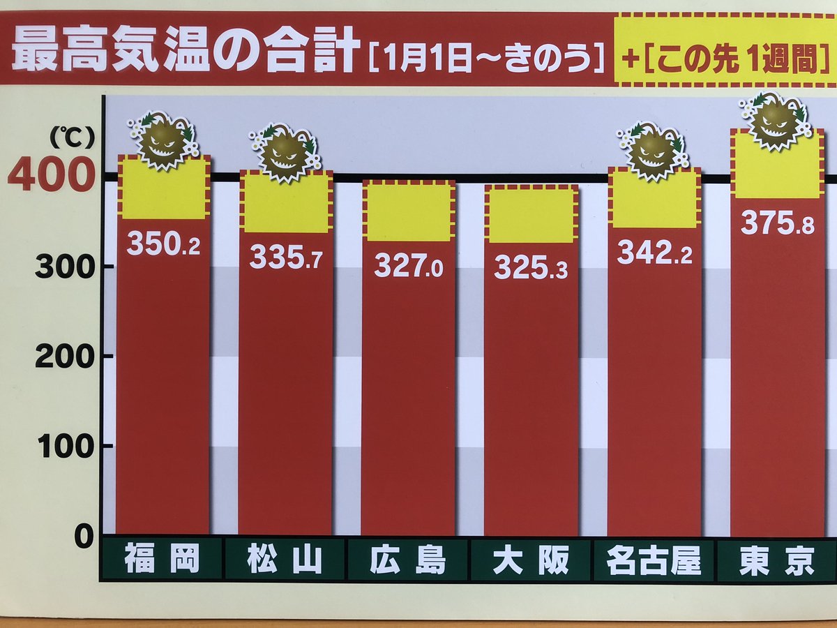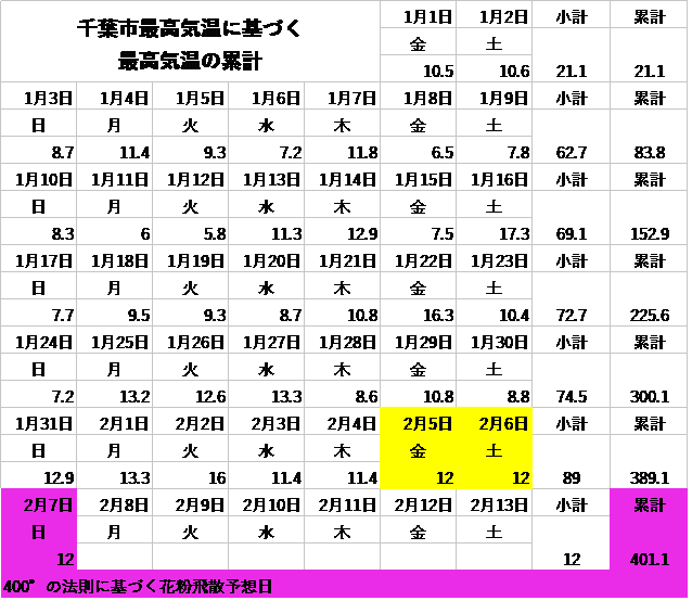 元旦からの最高気温の累計が400度を超えると花粉が飛散し始めるという目安です。