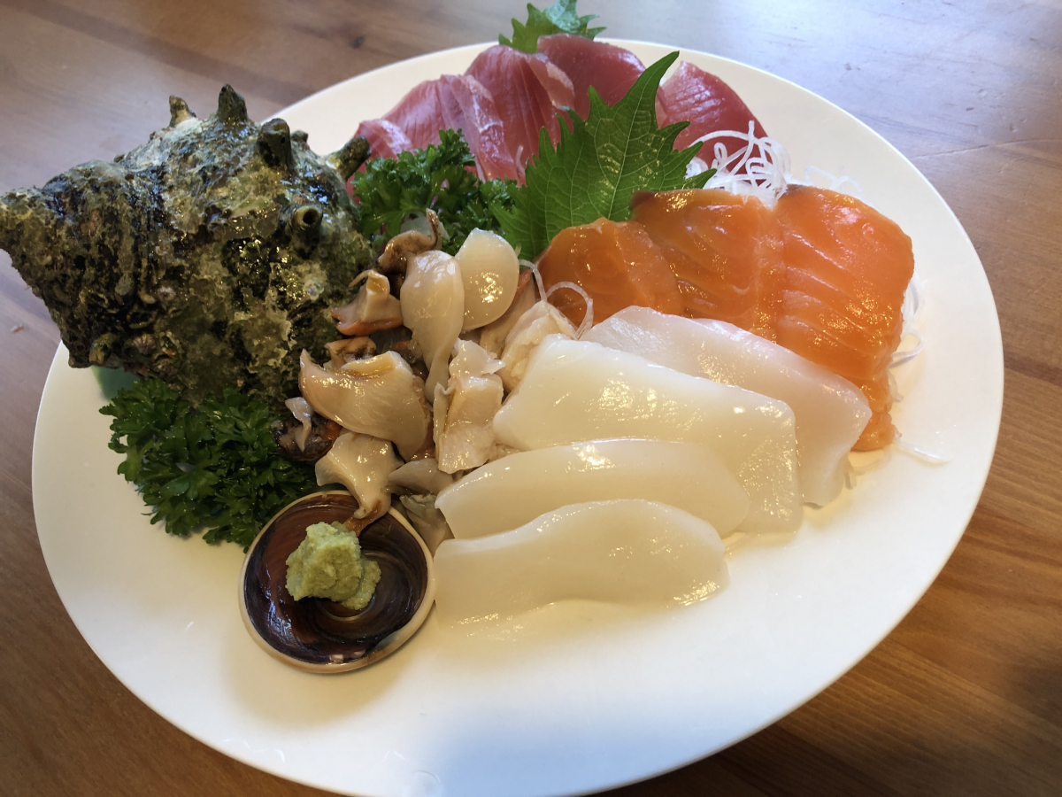 今日は、魚屋に行きサザエやマグロ等を買い自分でさばき刺し盛り作成(^^♪