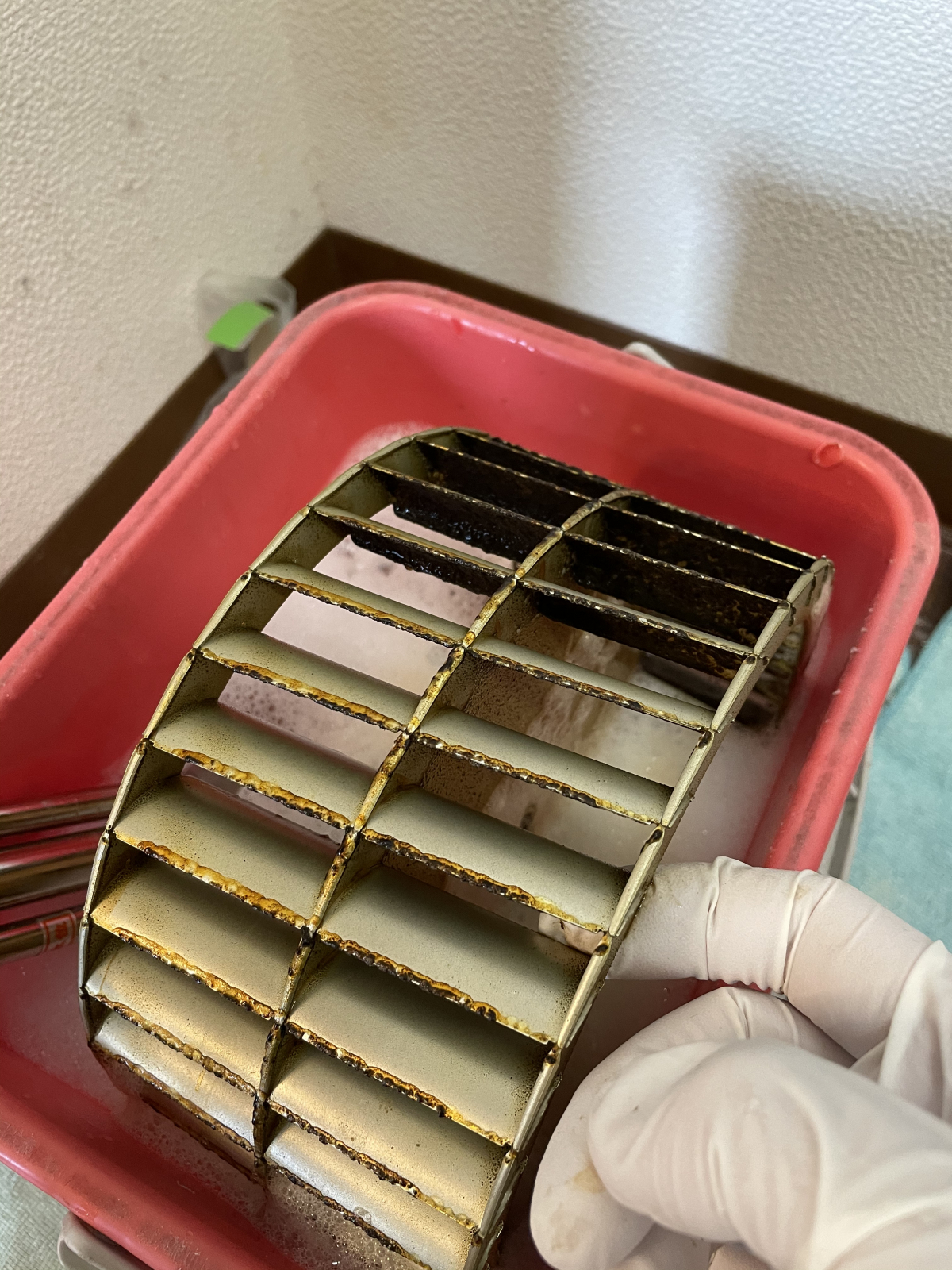 内部のシロッコファンを外し、ファンと内部の油を熱と薬剤を使い柔らかくします。
