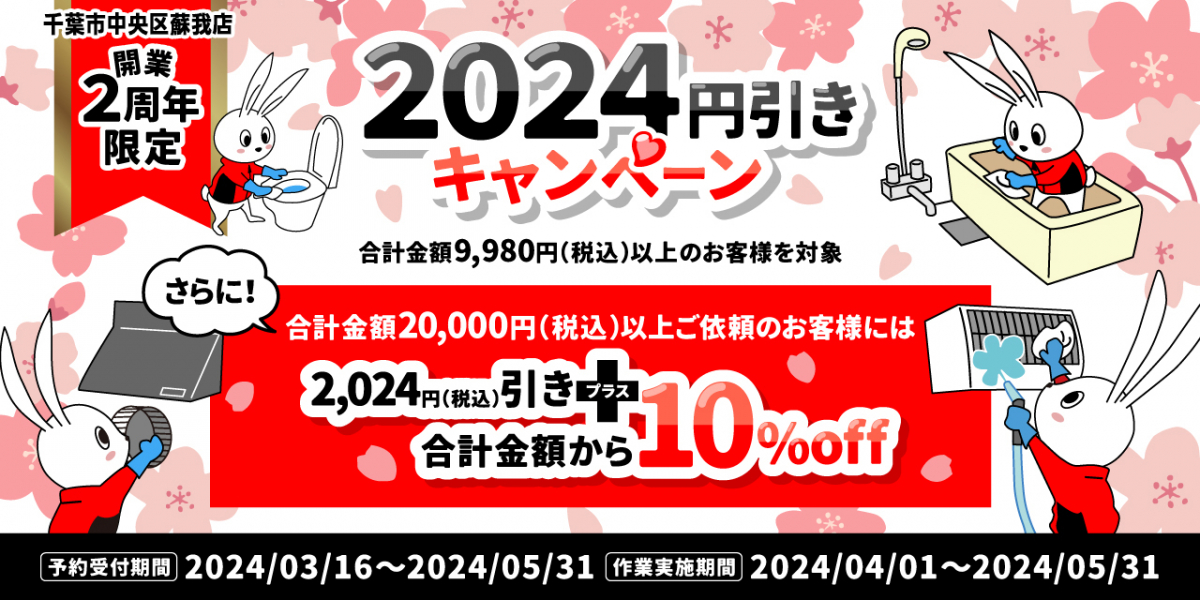 おそうじ革命 千葉市中央区蘇我店では、開業2周年限定の2024年(円)引きキャンペーンを実施中です!