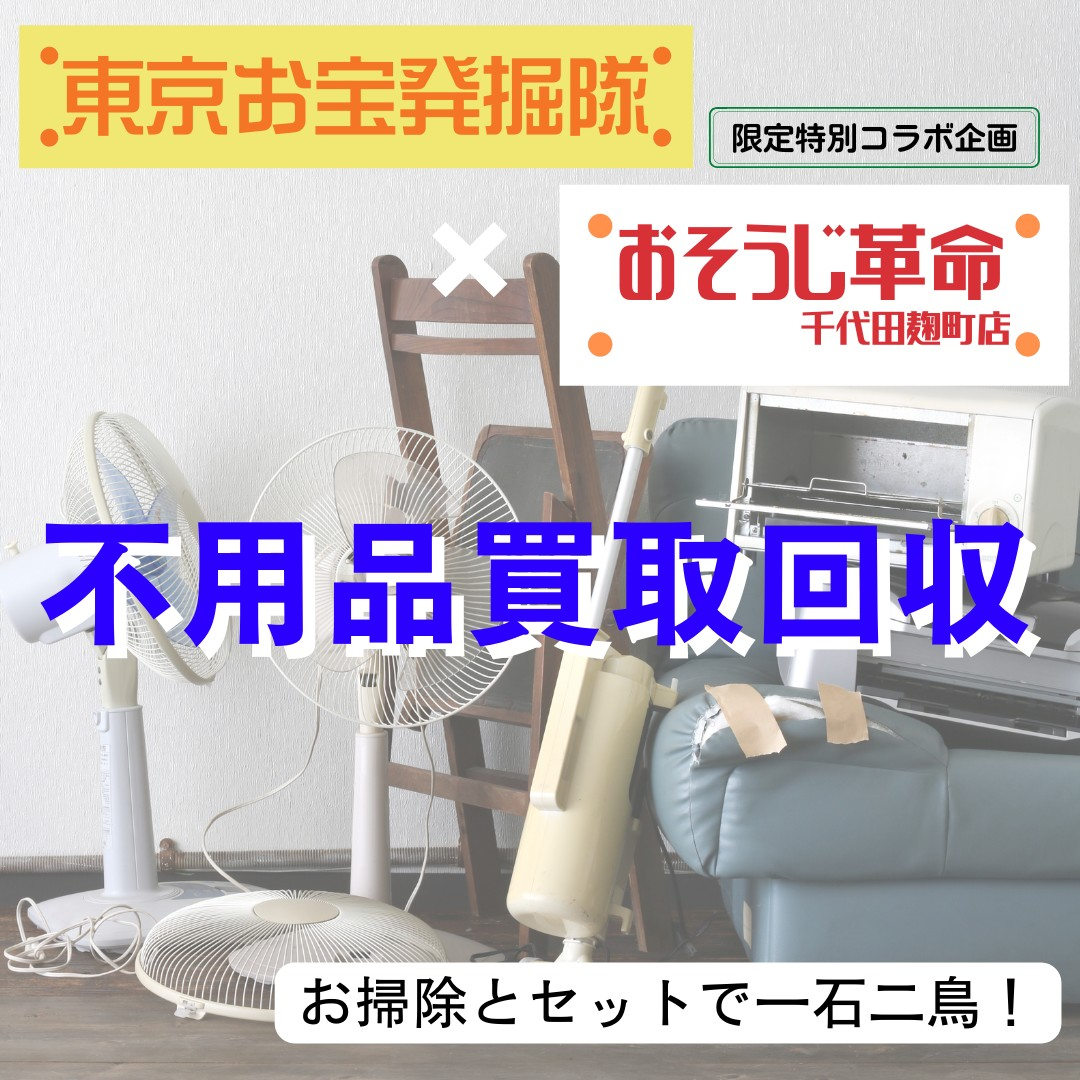 不用品買取回収中を拡大表示 『おそうじ革命千代田麴町店』と『東京お宝発掘隊』の特別限定コラボ企画です。