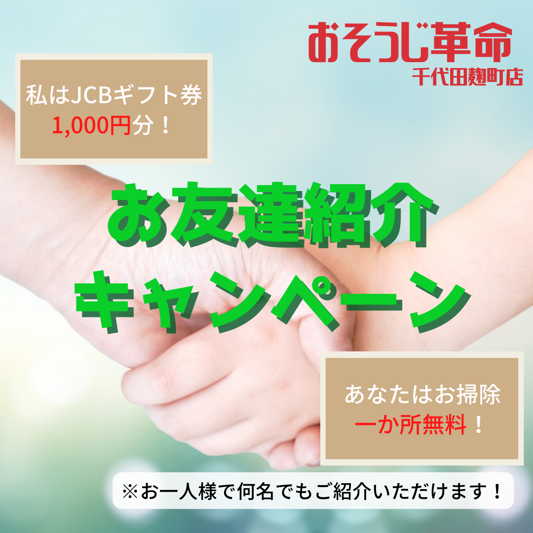 お客様のお友達を紹介していただき、お掃除した場合には紹介者の方にJCBギフト券1,000円分、
