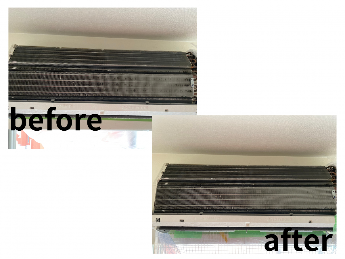 本日はエアコンの清掃のご依頼でした。 分解してみるとフィルターの下にあるアルミフィンに黒カビが見受けられました。 送風口のシロッコファンにもカビの付着がありました。 アルミフィンは空気中の水分を冷却して水に変換するところです。 そこにカビが付着すると冷却効果が減少しますし、シロッコファンへのカビの転移の原因にもなります。 しっかり掃除したい部分ですので、丁寧に作業させていただきました。