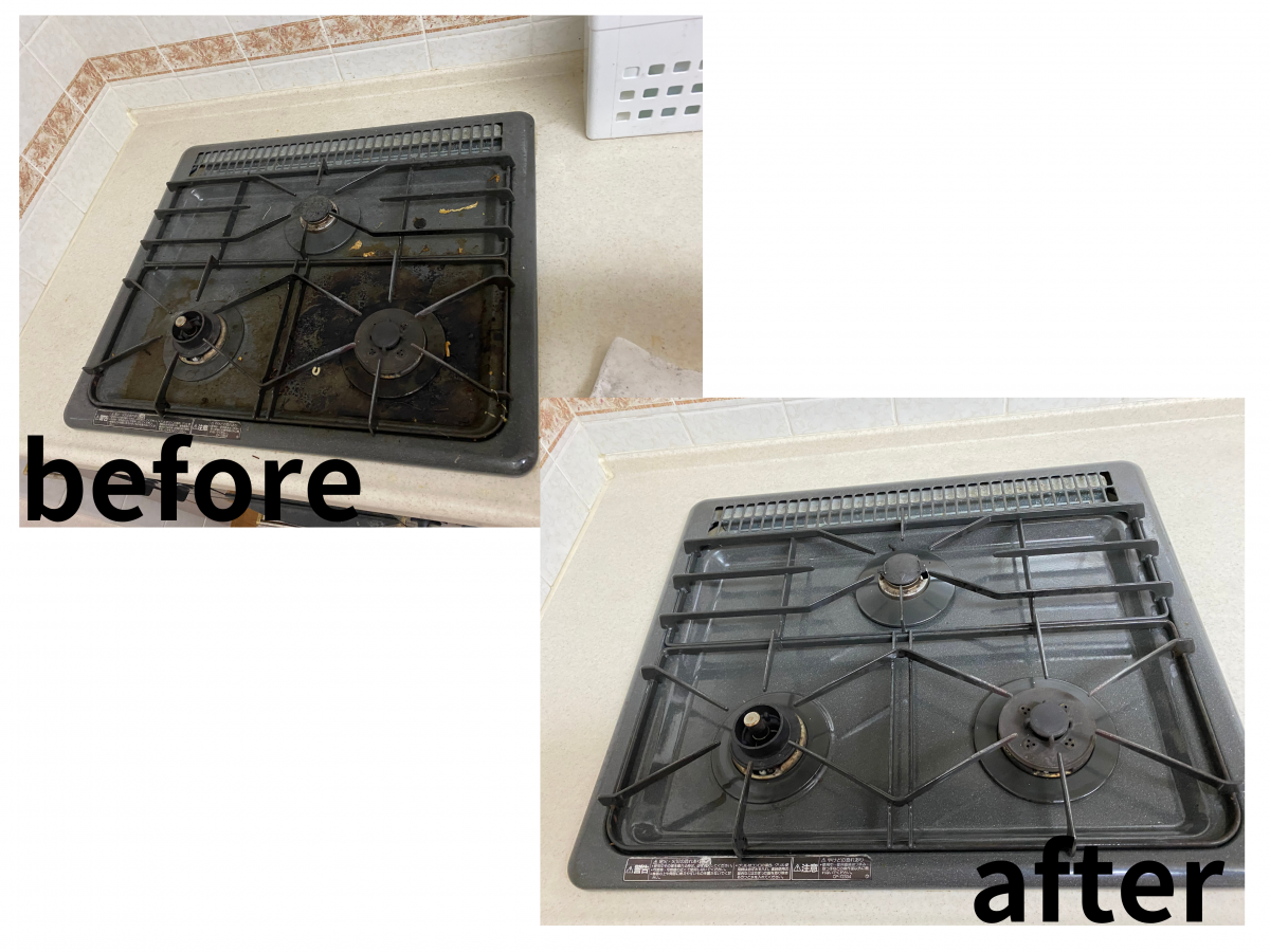 本日はキッチンの清掃のご依頼でした。 ガスコンロ上部には結構の焦付きが見られます。(ビフォーアフターの写真の角度が違ってごめんなさい。) 焦付きも色々な種類があってふやかしたり、焼き切ったり、洗剤や物理的に力で落としたりと多種にわたります。 プロの目で見て判断するのです。 むやみに作業して傷つけないよう作業させていただいてます。 気になる方は是非ご連絡下さいね!