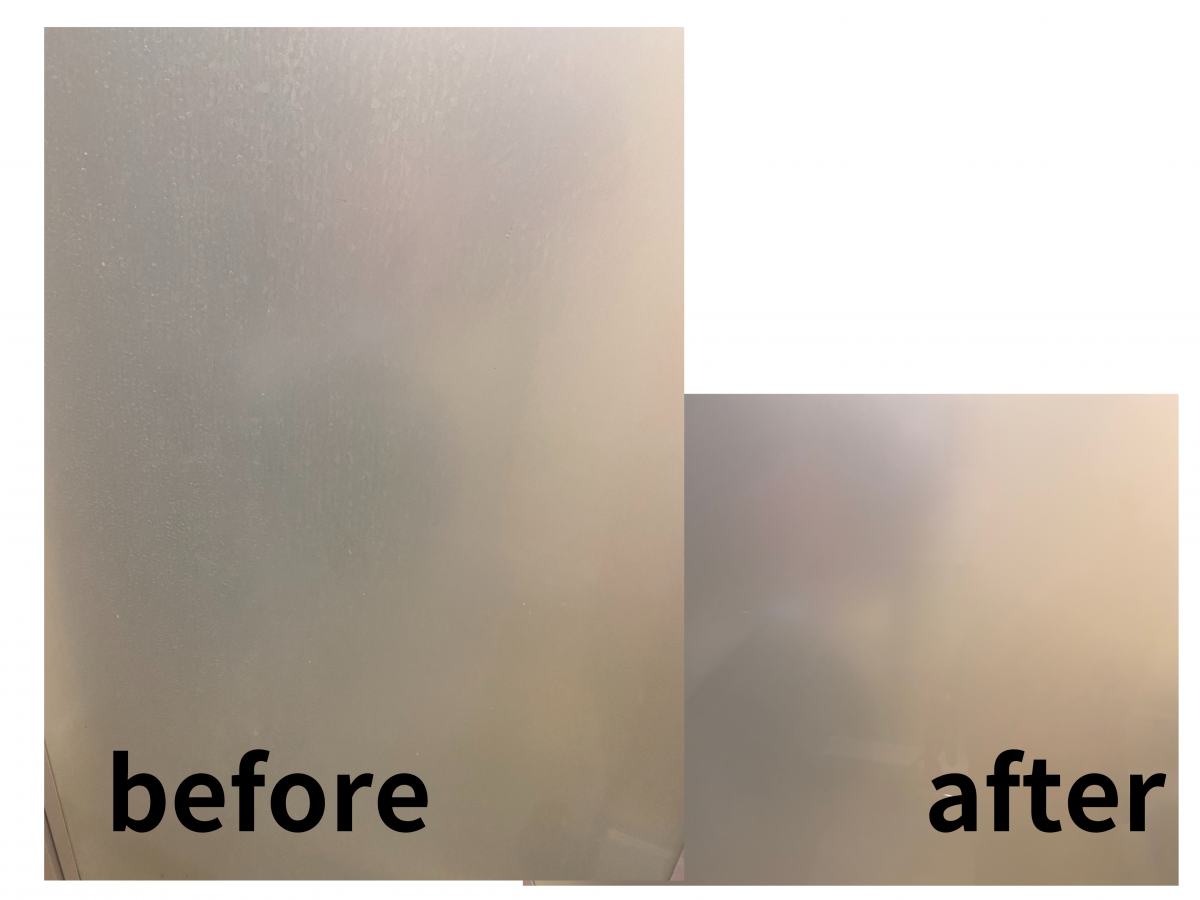 本日は浴室の清掃のご依頼でした。 浴室のドアが磨りガラスのお宅もありますよね。 水垢が付着したらなかなか落ちません! 写真を見てもらうとわかります。 何時間かけても落ちません、疲れちゃいますね! プロは写真のように綺麗に除去します。 年末の大掃除に向けてお掃除のご依頼お待ちしております。