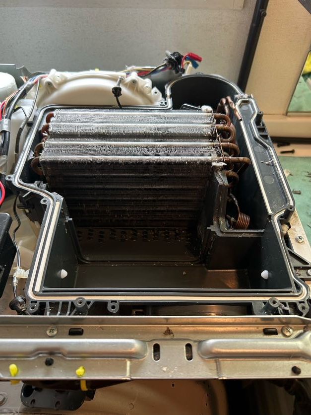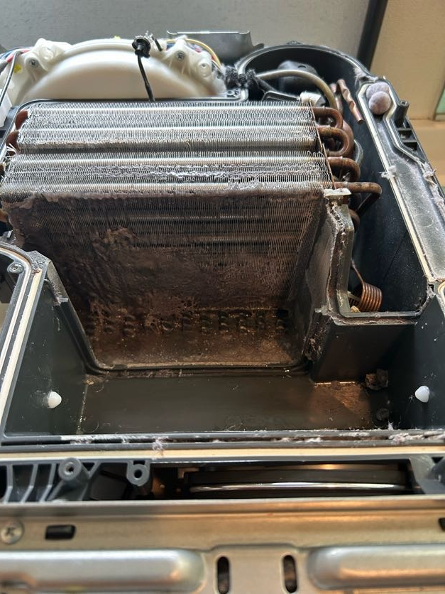 とのご相談があり、内部を分解してみると……乾燥ユニット内部にびっしり詰まったホコリが。