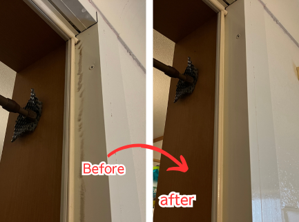 枠のすき間やドア横のパネルに黒ずみがしっかり残っていました。