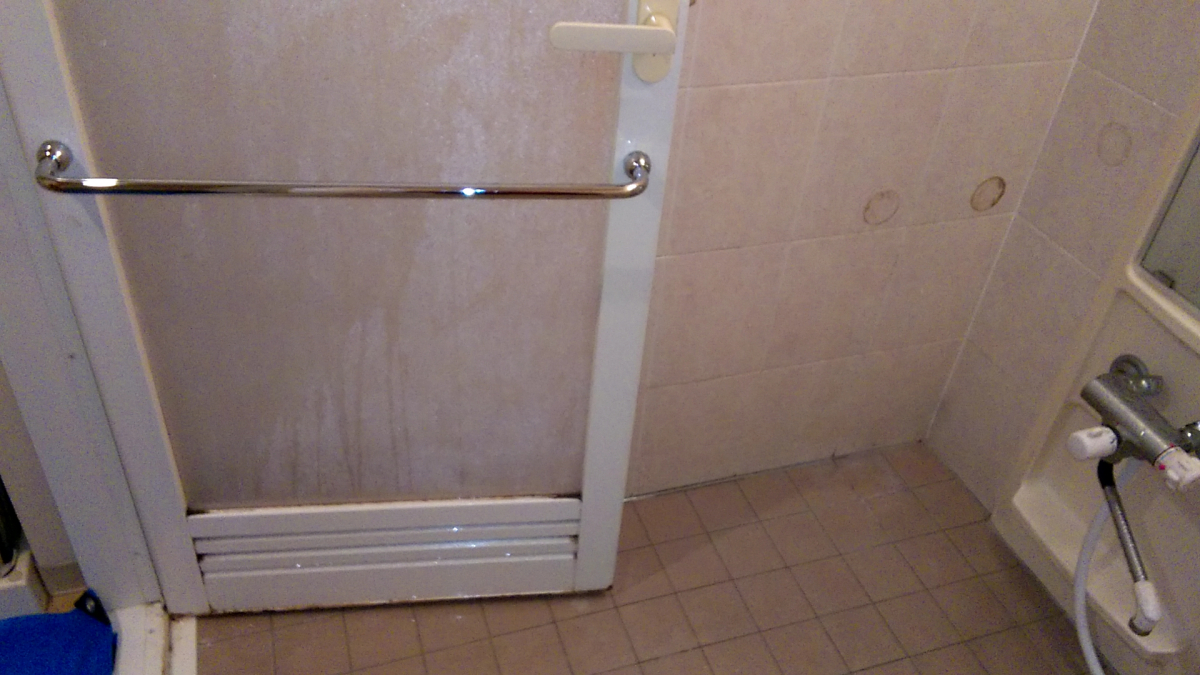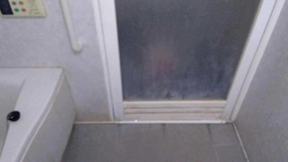水垢、カビ、石鹸カス、皮脂汚れなど様々な汚れが溜まっていて