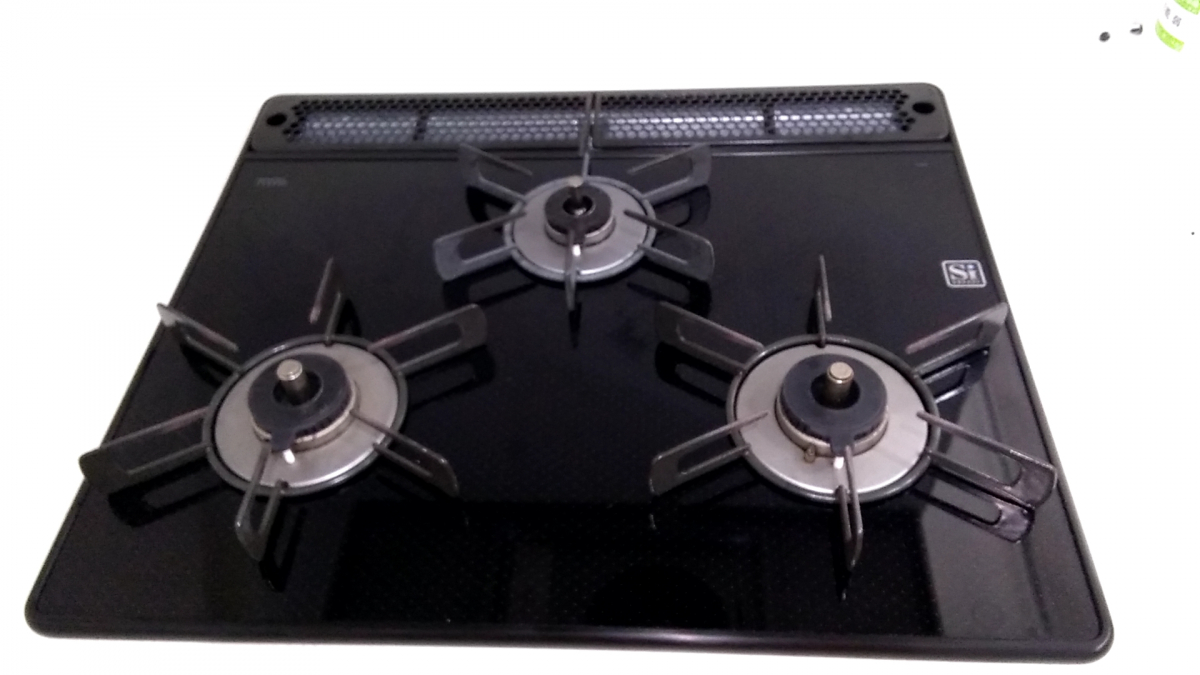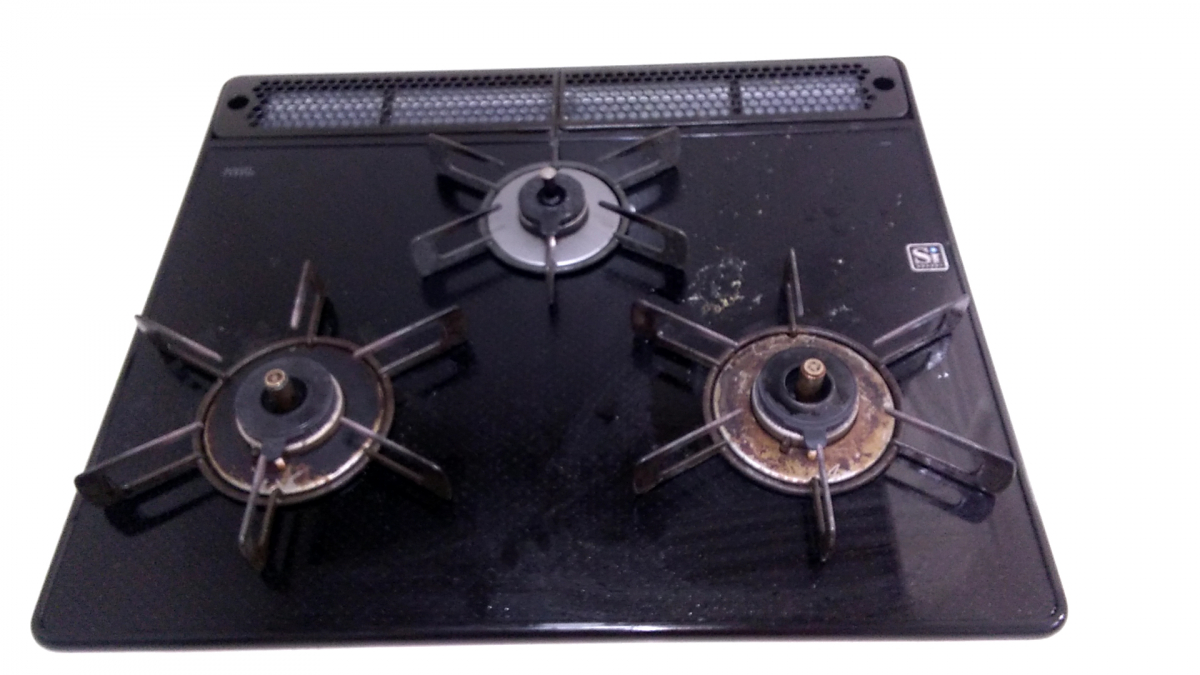 天板についた噴きこぼれ落とし、五徳受け皿のコゲ(左皿がコゲ付きが強かった)