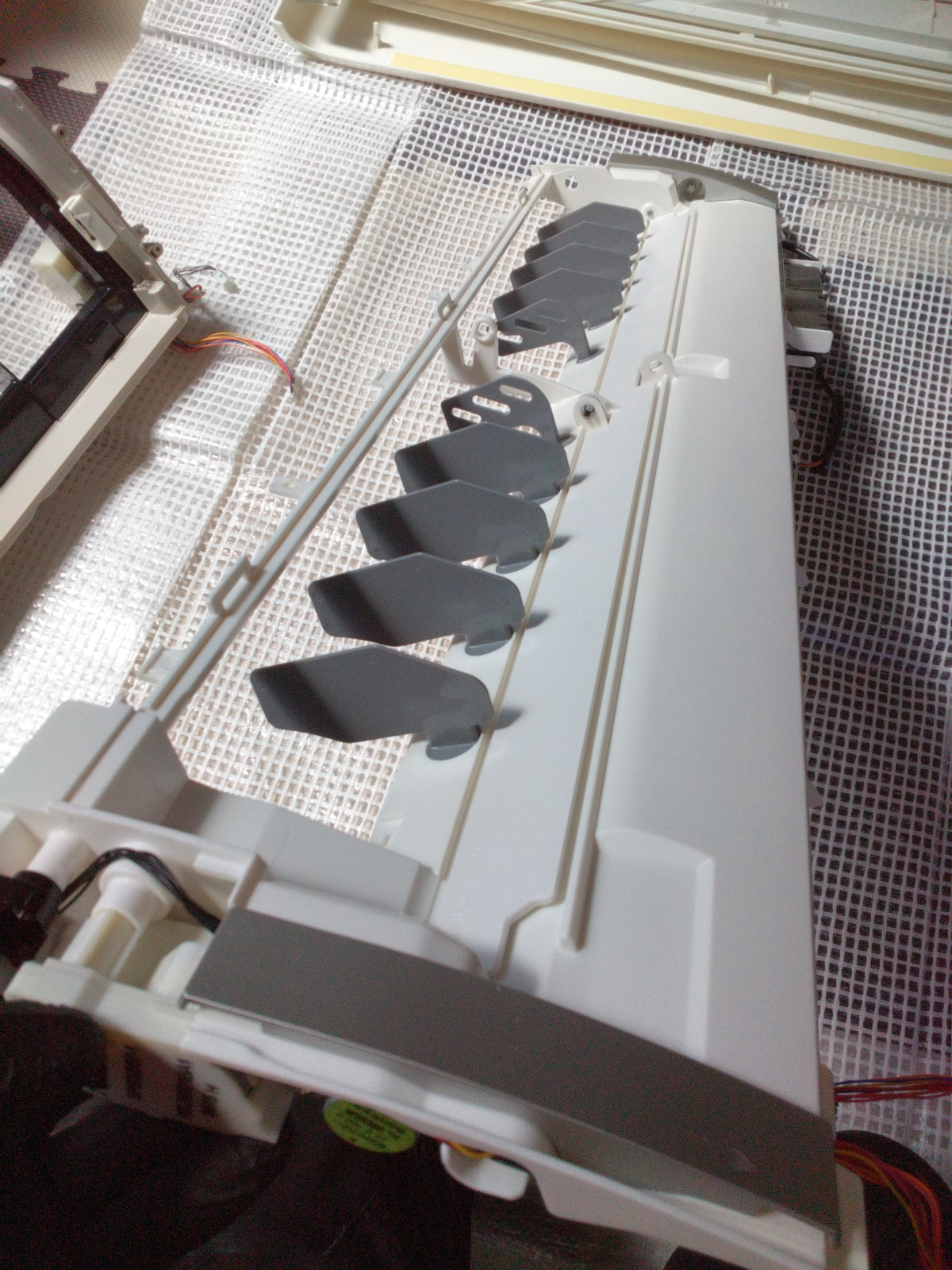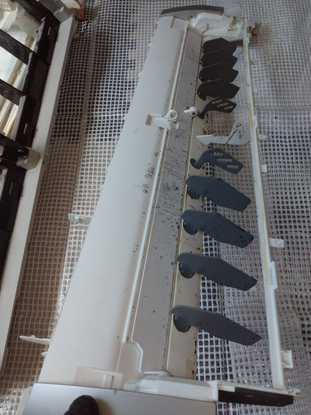洗浄後にモーターなどの電装部品を組み立て済みですが、薬剤&水洗浄で隅々まで汚れ&カビが除去できています。