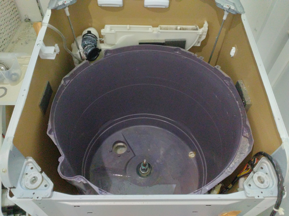 ここまで来れば通常の洗濯機を同じなので、購入した専用工具を使用して!?と思ったらセンターボルトの軸が長くて購入したソケットがナットにかからない(´;ω;`)ウゥゥ