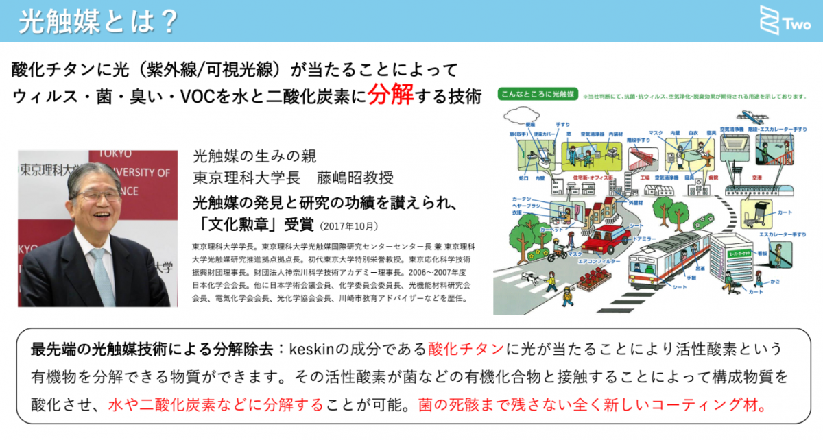 光触媒とは、二酸化チタンを主成分としたコーティング剤で、二酸化チタンを壁面や様々な製品の表面に塗布し、太陽や蛍光灯などの光が当ると、その表面に酸化還元反応がおこり、空気の浄化やコーティング面の汚れ防止効果を発揮する技術です。