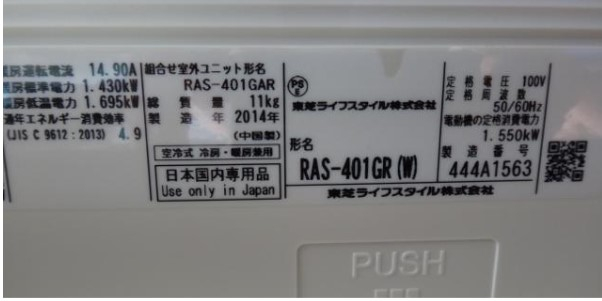 エアコン本体下部に型番の記載があります。「RAS-401GR」、フィルターも通り抜ける細かいPM2.5も集じんしてくれる高機能なエアコンです。