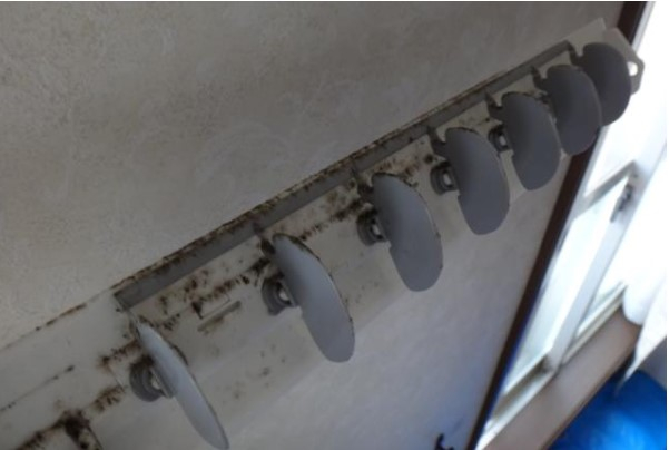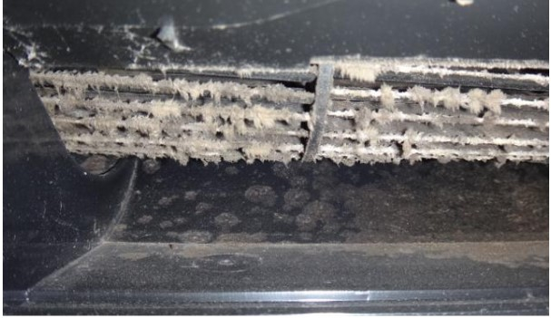 これは吹き出し口の部分です、黒いファン1枚、1枚に、ホコリとカビがびっちりついています。