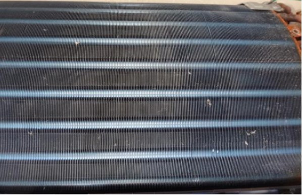 エアコン本体にカバーをかけて、洗浄していきます。こちらは洗浄前のアルミフィンです。細かい目にホコリがのっています。