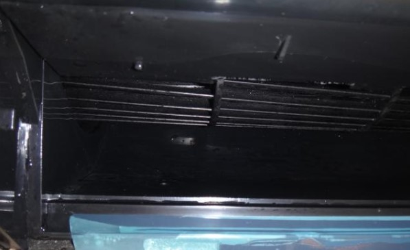 左右風向のルーバーを外します。見るとカビがついて黒くなっています。ファンから送られて来た風はここを通ってきたんですね・・・
