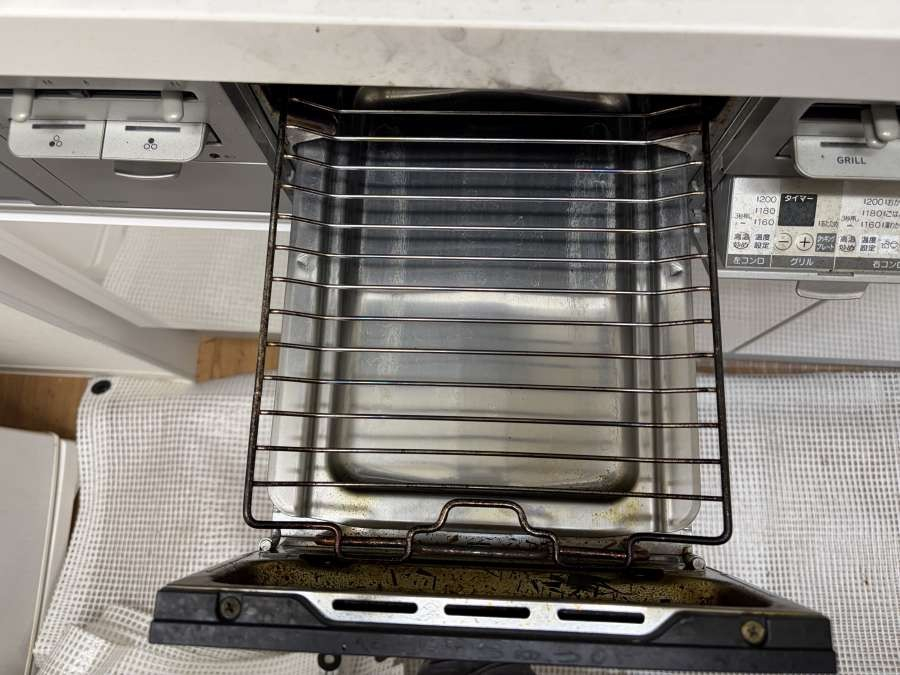 ① グリル内部にこびり付いた焦げ付きや油汚れを、素材を傷めないよう丁寧に除去しました。